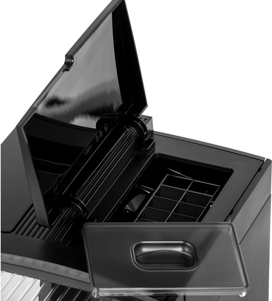 дисплей, индикатор включения, индикатор уровня воды, индикация отсутствия кофе, индикация работы, контейнер для отходов, отсек для шнура, подсветка, съемный лоток для сбора капель, Индикация готовности к работе, Индикация необходимости очистки от накипи, Очистка от накипи, Регулировка температуры, Режим самоочистки, Фильтр от накипи
