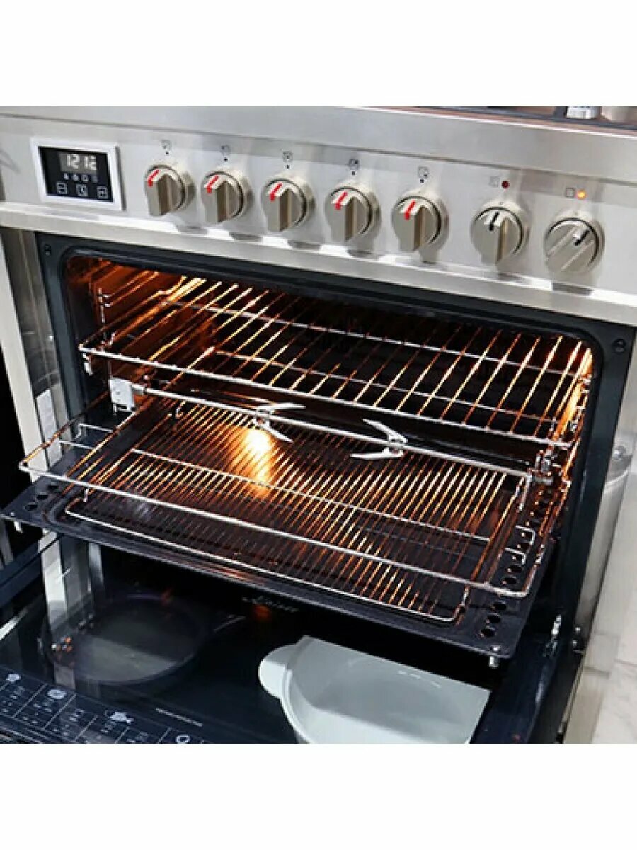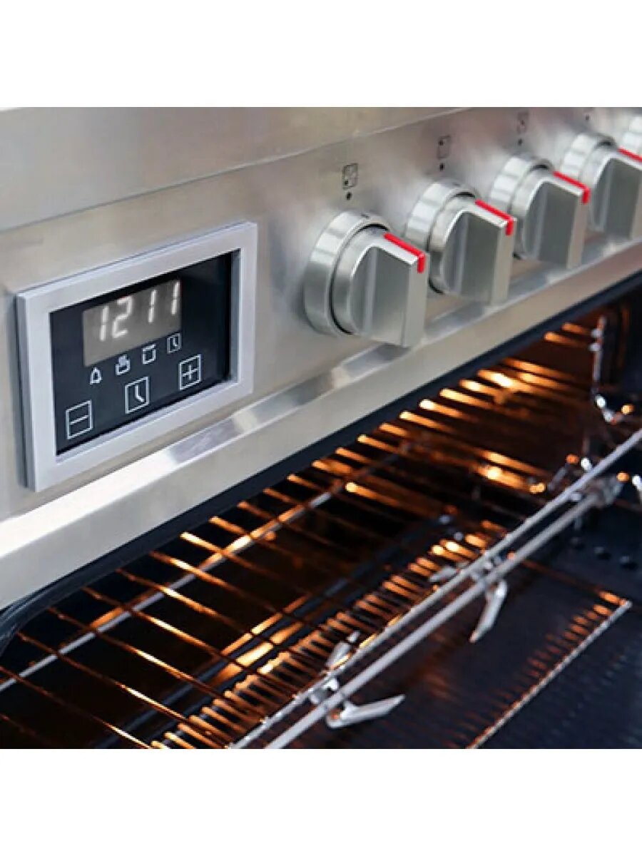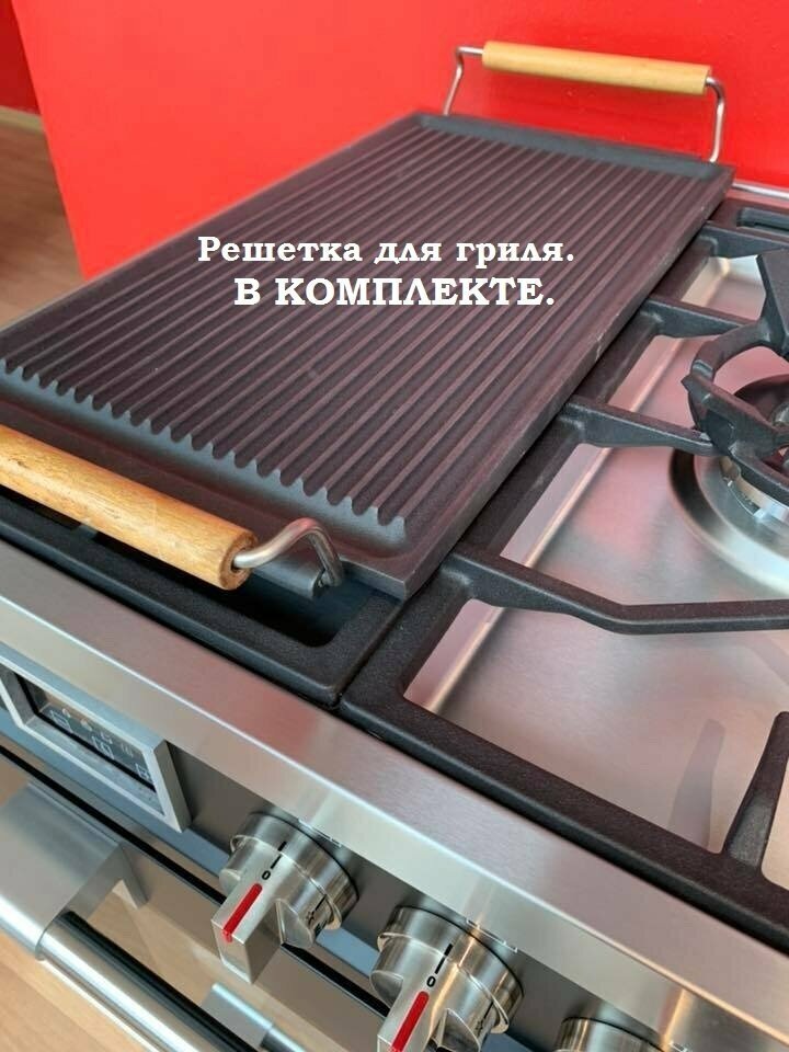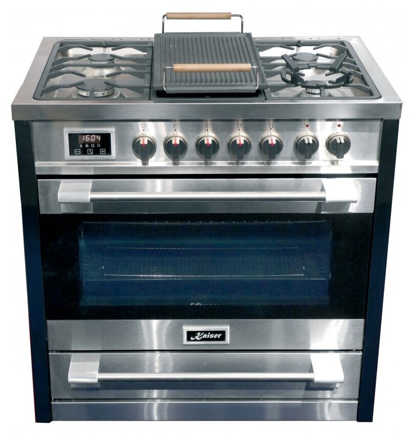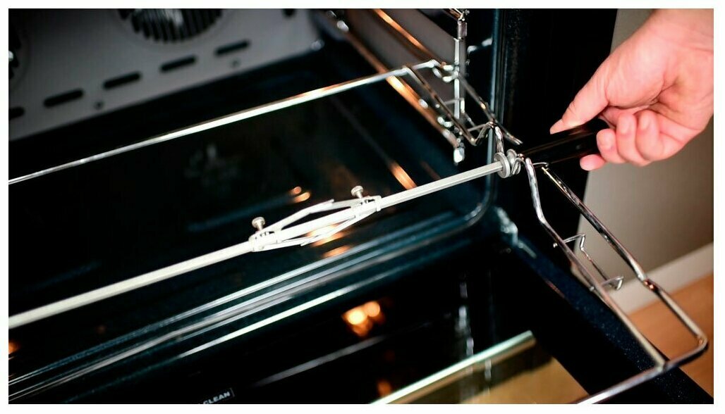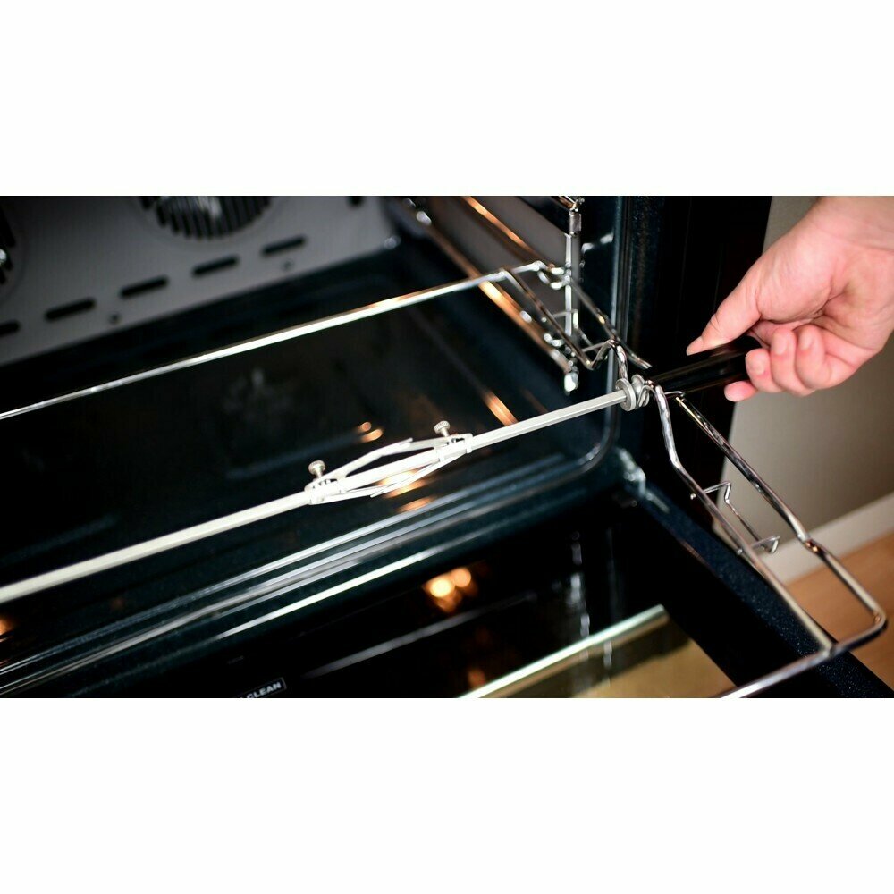 дисплей, часы, чугунные решетки, эмаль легкой чистки, Встроенные часы, Рецепты на двери, Хромированные направляющие, Электромеханический вертел, Ящик для посуды, вертел, подсветка духовки, телескопические направляющие, ящик для посуды