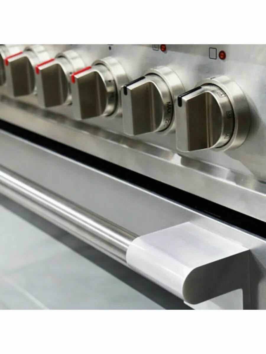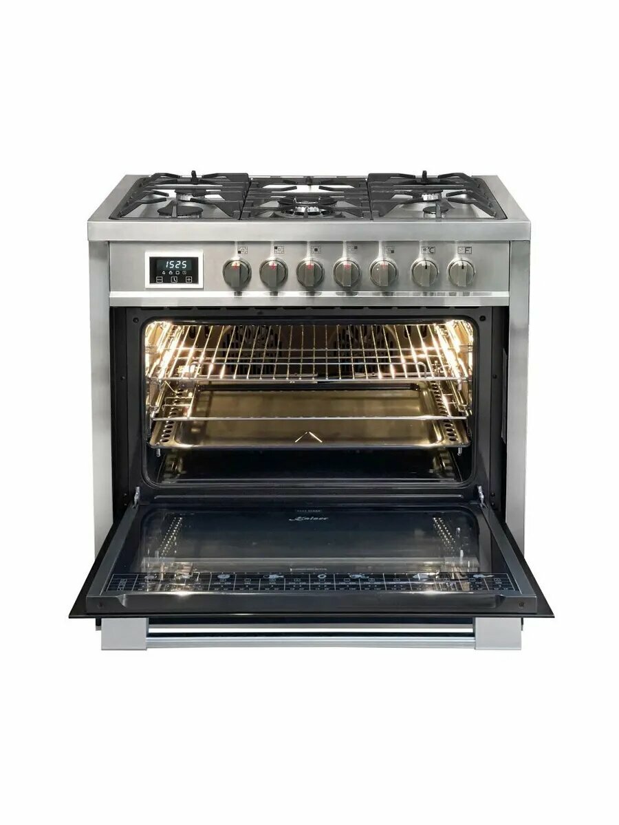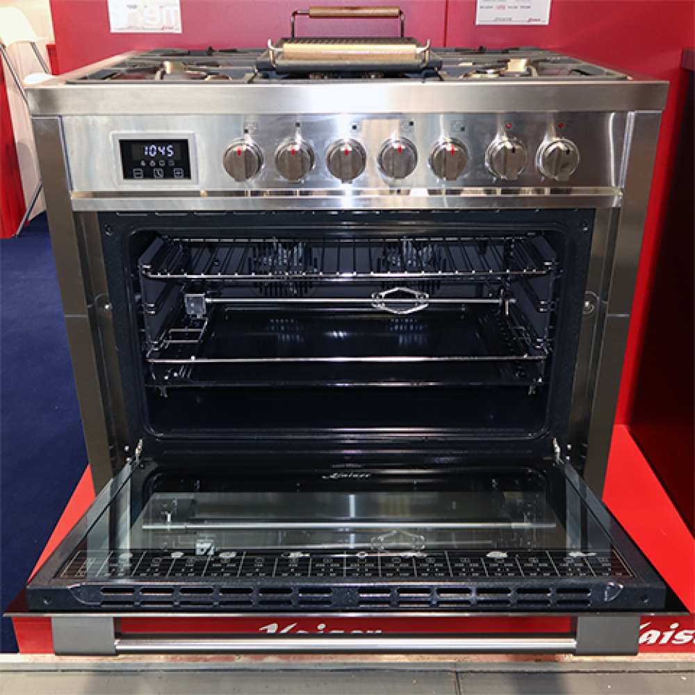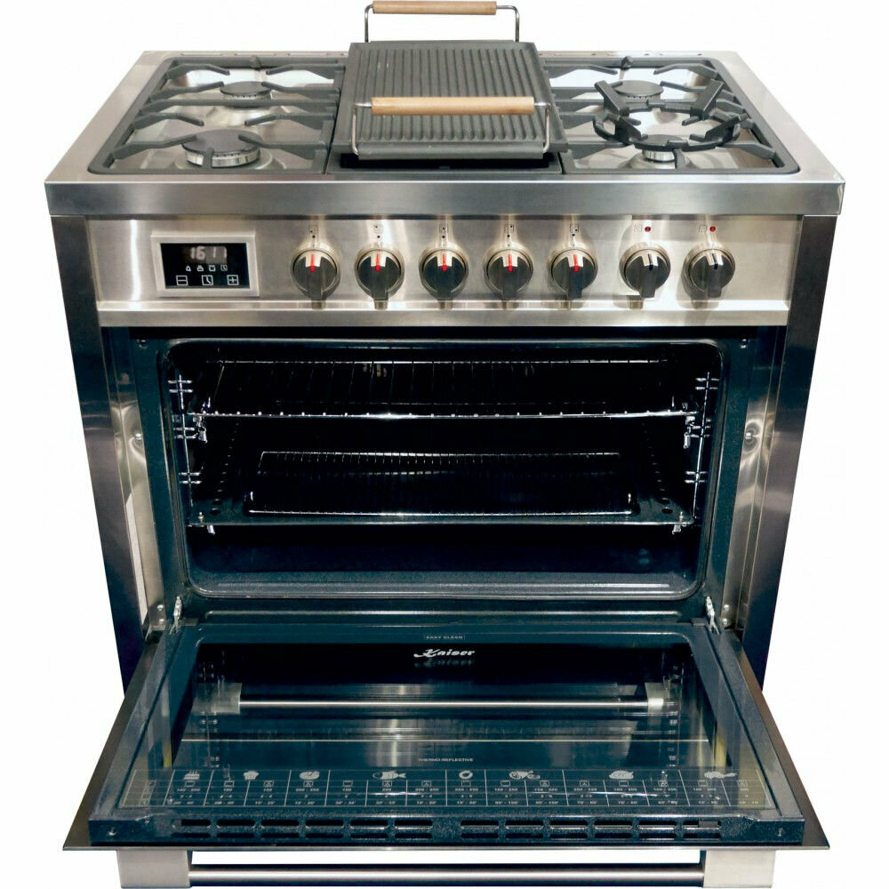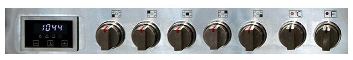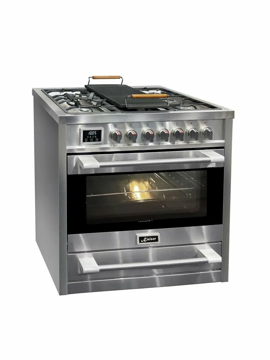 дисплей, часы, чугунные решетки, эмаль легкой чистки, Встроенные часы, Рецепты на двери, Хромированные направляющие, Электромеханический вертел, Ящик для посуды, вертел, подсветка духовки, телескопические направляющие, ящик для посуды