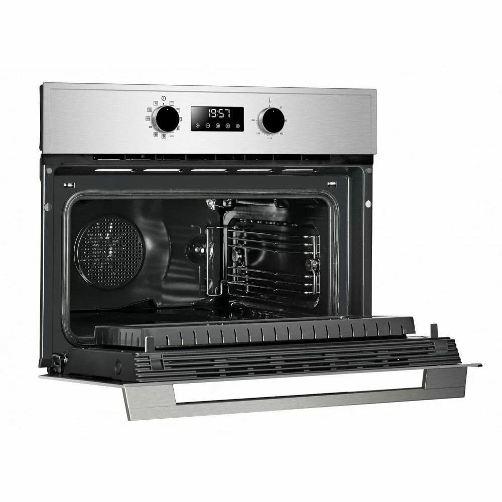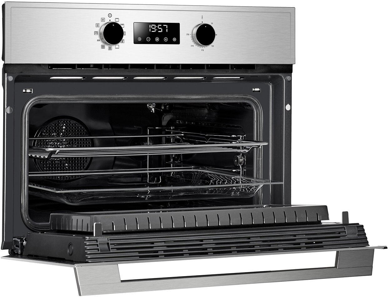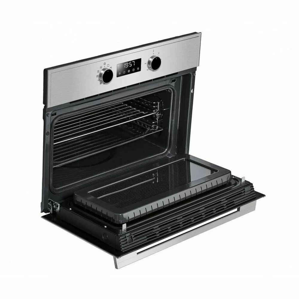 Дверца духового шкафа открывается/закрывается плавно, без толчков и усилий, так как она оснащена доводчиком. Камера хорошо освещается галогенной лампой: всё её пространство прекрасно просматривается. А управлять процессом можно легко и комфортно с панелью управления, включающей поворотные/сенсорные переключатели и информативный чёткий дисплей.