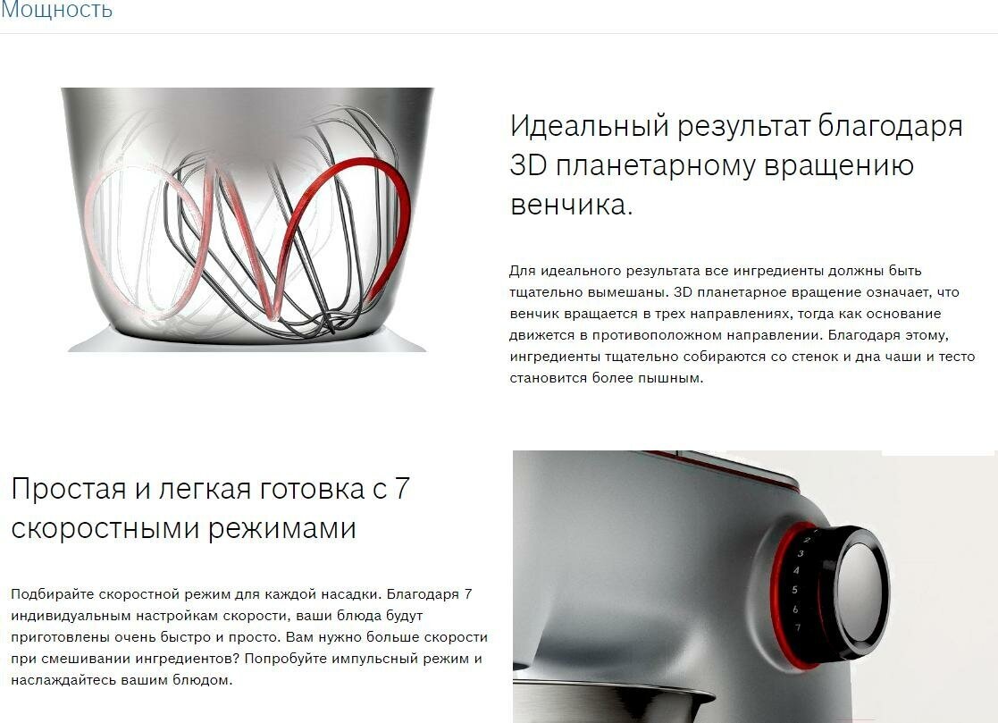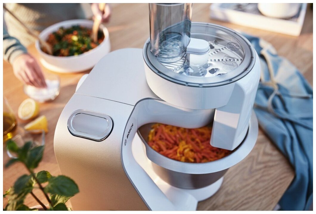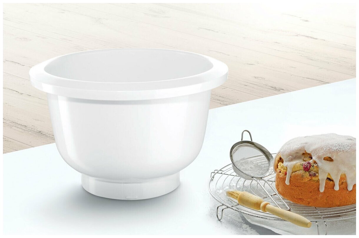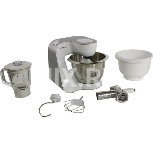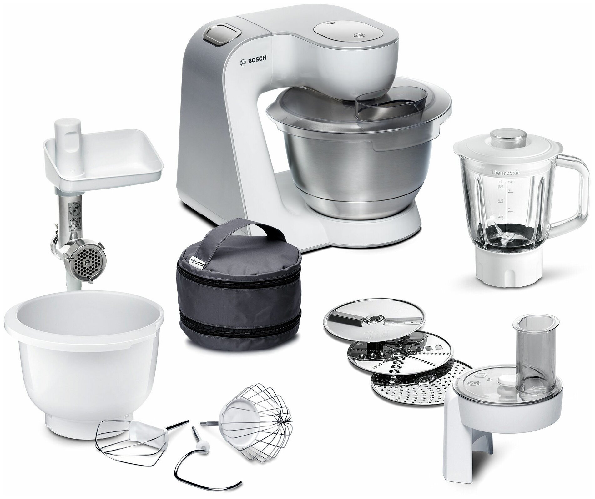 Венчик, насадка для перемешивания, крюк для теста, дополнительная чаша, кожух для защиты от брызг, универсальная резка, 3 режущих диска, мясорубка, блендер, сумка для хранения насадок, инструкция