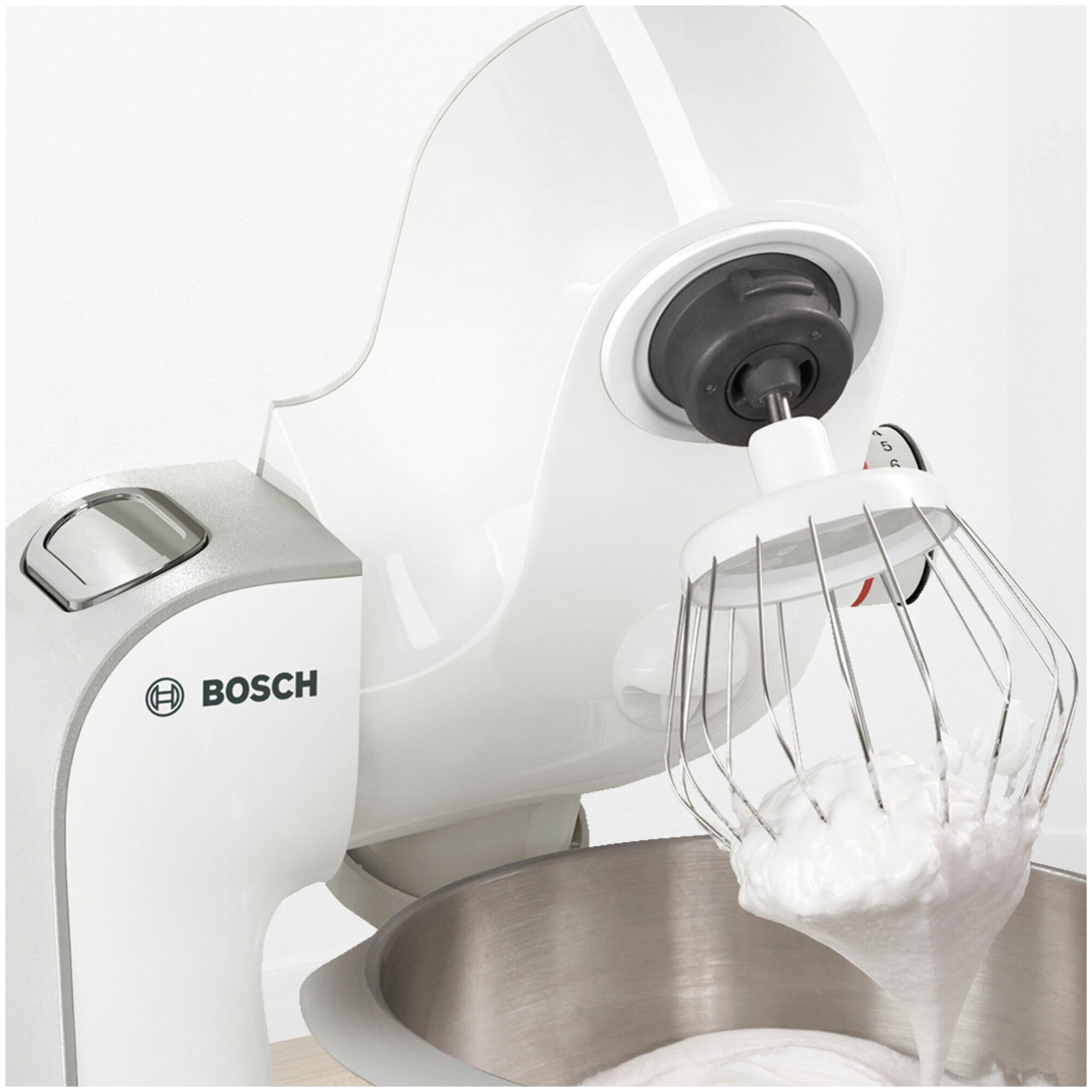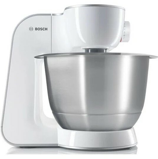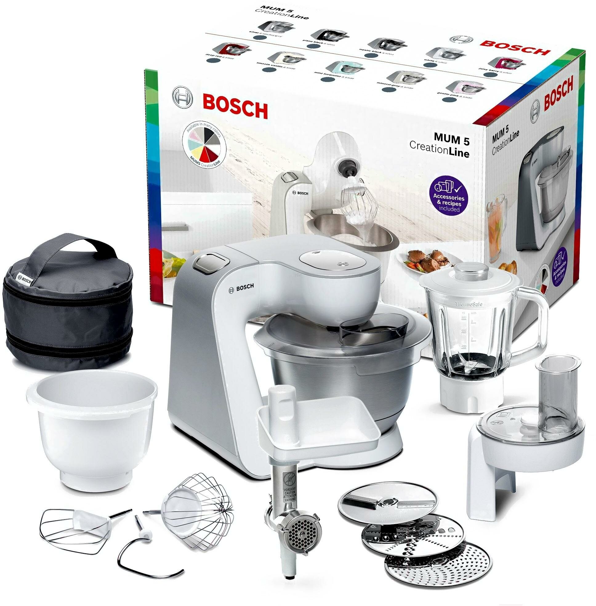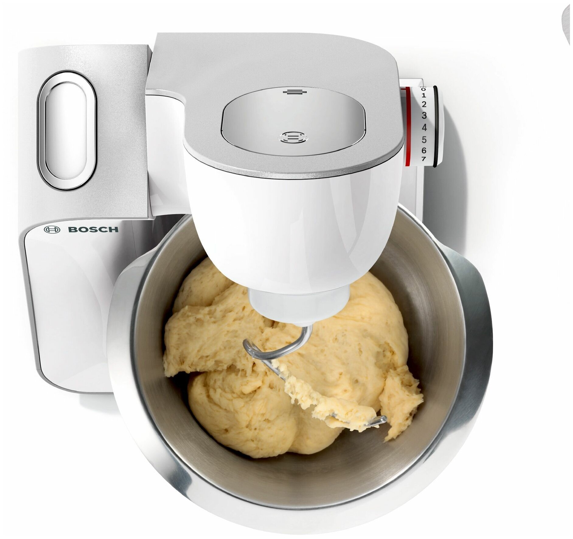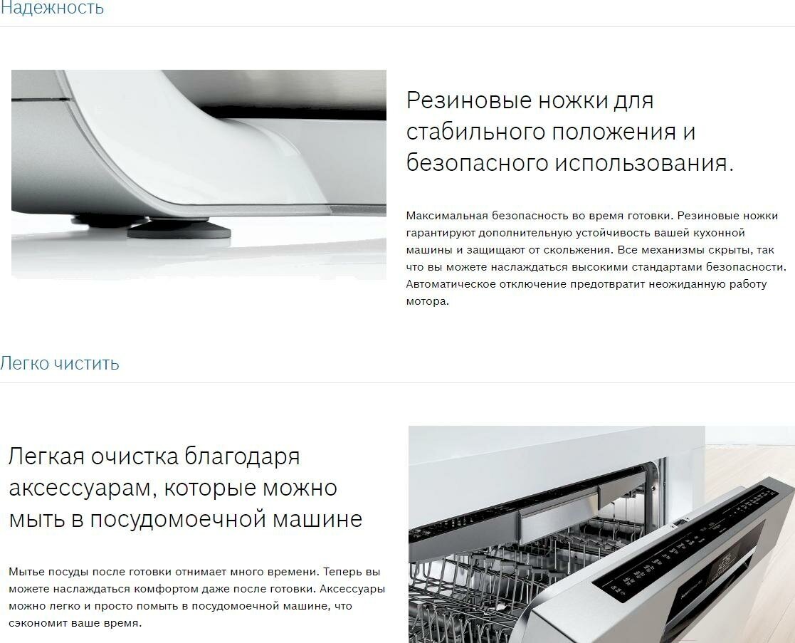 Венчик, насадка для перемешивания, крюк для теста, дополнительная чаша, кожух для защиты от брызг, универсальная резка, 3 режущих диска, мясорубка, блендер, сумка для хранения насадок, инструкция