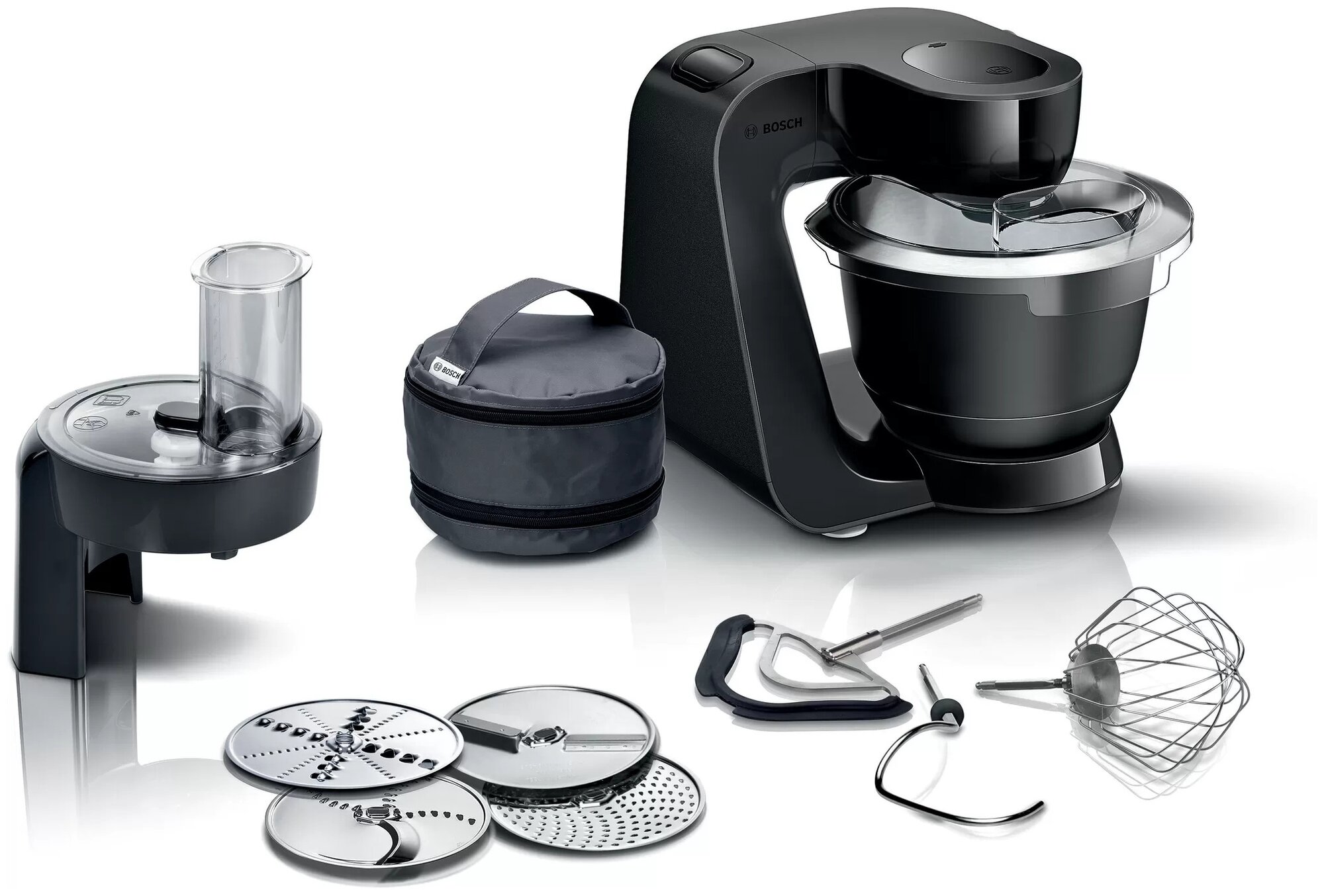 кухонный комбайн - 1 шт, шинковка - 1 шт, терка - 1 шт, венчик для взбивания - 1 шт, венчик для жидкого теста - 1 шт, крюк для теста, терка мелкая - 1 шт, инструкция - 1 шт, чехол - 1 шт, кожух для защиты от брызг - 1 шт