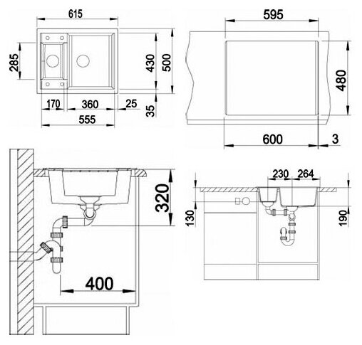 клапан-автомат, корзинчатый вентиль, отверстие под смеситель, Мойка 1 шт, Отводная арматура 3 ? дюйма с клапаном-автоматом для основной чаши, корзинчатый вентиль 3 ? дюйма для дополнительной чаши.