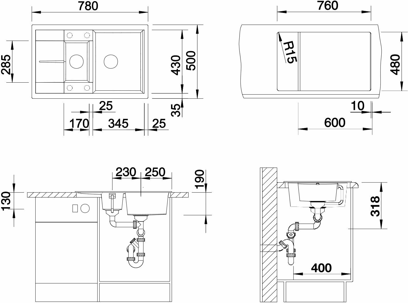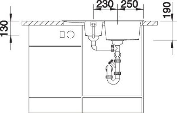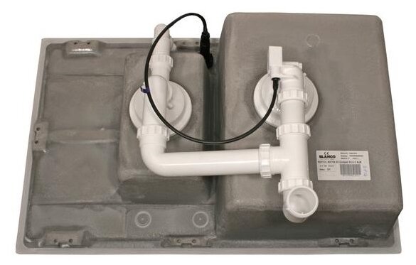 отводная арматура с клапаном-автоматом 3 ½'' для основной чаши; корзинчатый вентиль 3 ½'' для дополнительной чаши; материал: искусственный камень Silgranit™ Puradur™; подходит для установки в кухонный шкаф шириной 60 см; глубина дополнительной чаши 13 см