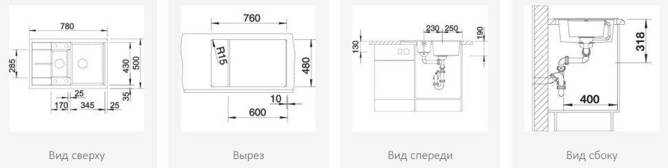 отводная арматура с клапаном-автоматом 3 ½'' для основной чаши; корзинчатый вентиль 3 ½'' для дополнительной чаши; материал: искусственный камень Silgranit™ Puradur™; подходит для установки в кухонный шкаф шириной 60 см; глубина дополнительной чаши 13 см