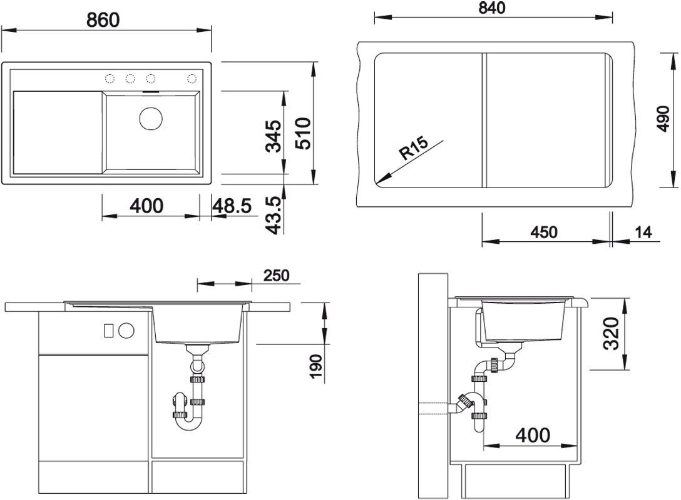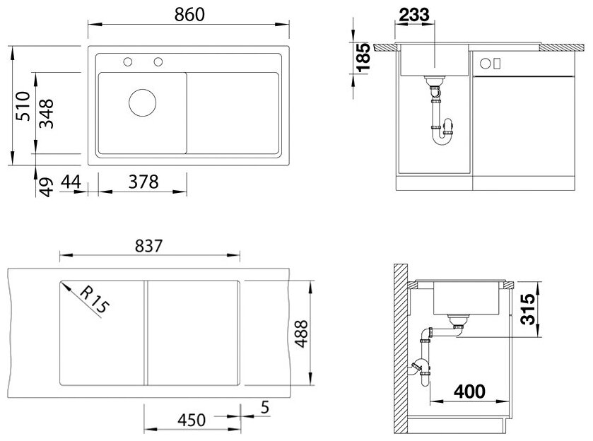 материал: Silgranit™ Puradur™; разделочная доска из закаленного черного стекла; отводная арматура InFino® с клапаном-автоматом 3½" (арт. 234079); установка: над столешницей, под столешницу