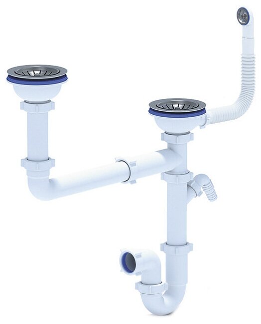 корзинчатый вентиль, отверстие под смеситель, сливная арматура, Отводная арматура для двух разноуровневых чаш с выпусками 3 ½ ” (D=90мм) и переливом