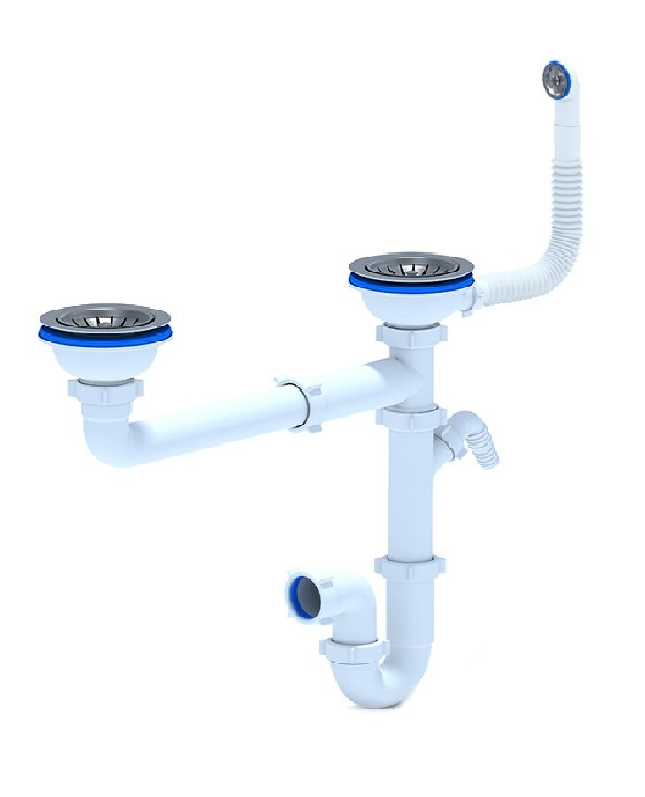 корзинчатый вентиль, отверстие под кран-фильтр, отверстие под смеситель, сливная арматура, Отводная арматура с выпуском для двух одноуровневых чаш 3 ½ ” (D=90 мм) с переливом, Отводная арматура с выпуском для двух одноуровневых чаш 3 ∎ ∎ (D=90 мм) с переливом