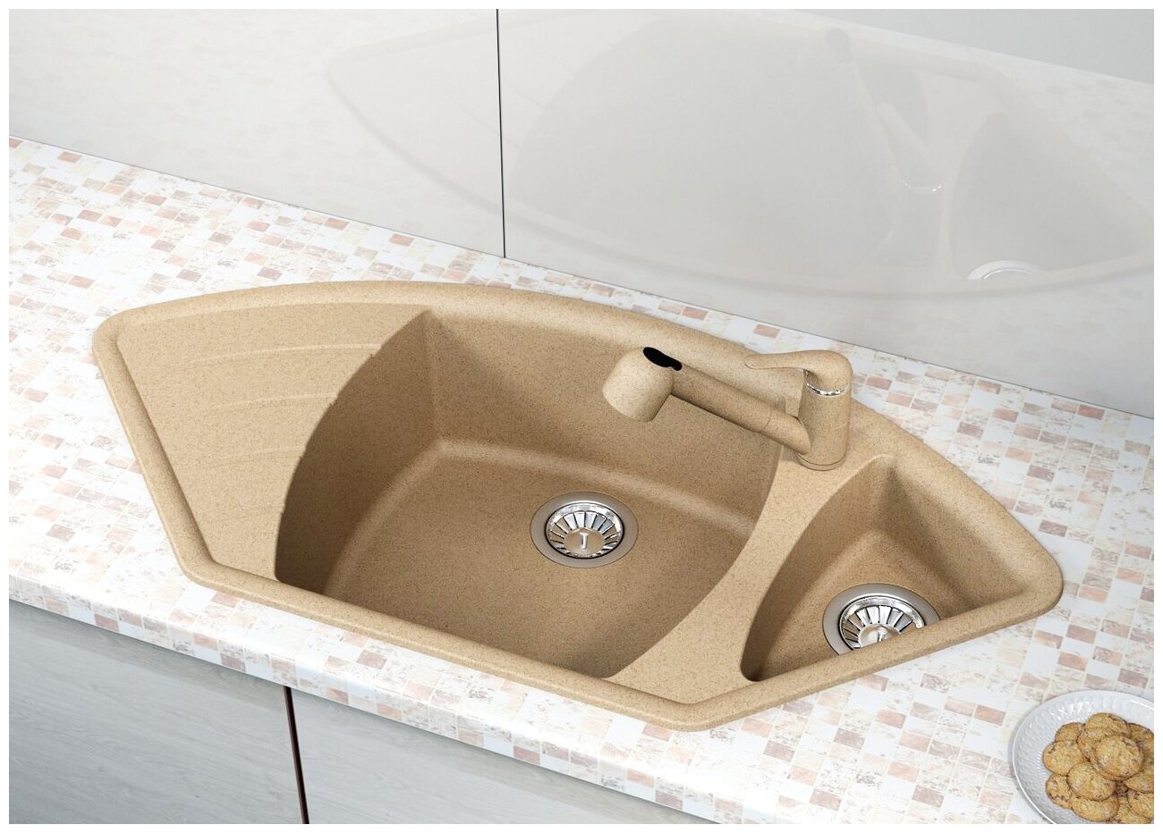 дополнительная чаша, угловая, Дополнительная чашаПереливС сифономСливные желобки на крыле, ПереливС сифоном, корзинчатый вентиль, отверстие под смеситель, сливная арматура