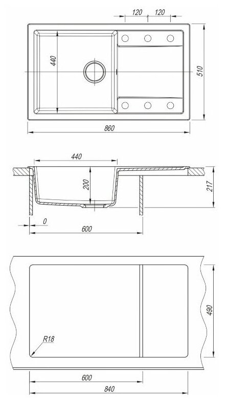 ПереливС сифономСливные желобки на крыле, отверстие под смеситель