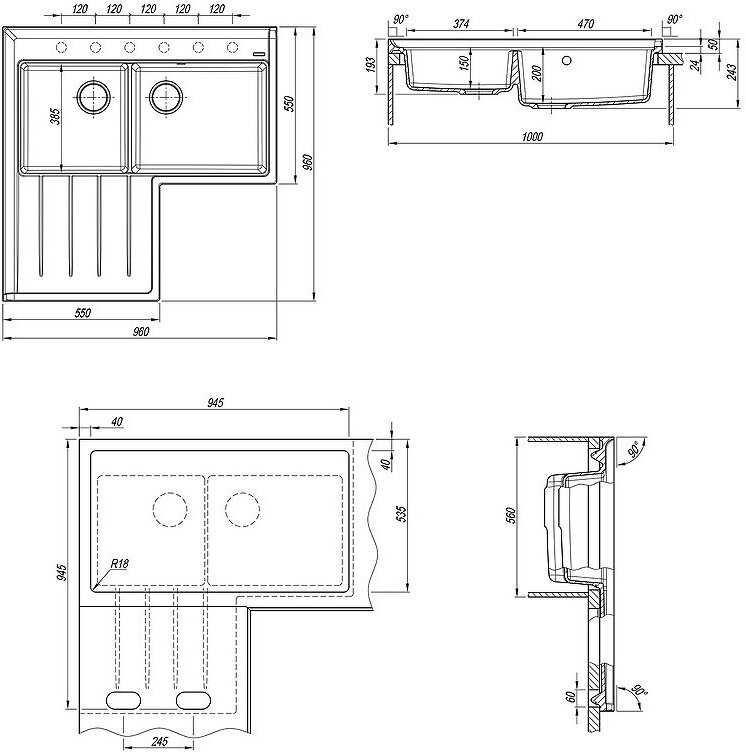 корзинчатый вентиль, сливная арматура, Доска разделочная 3039, Отводная арматура для двух разноуровневых чаш с выпусками 3 ½ ” (D=90мм) и переливом, Отводная арматура с выпуском 3 ? ” (D=90 мм) и переливом, мойка