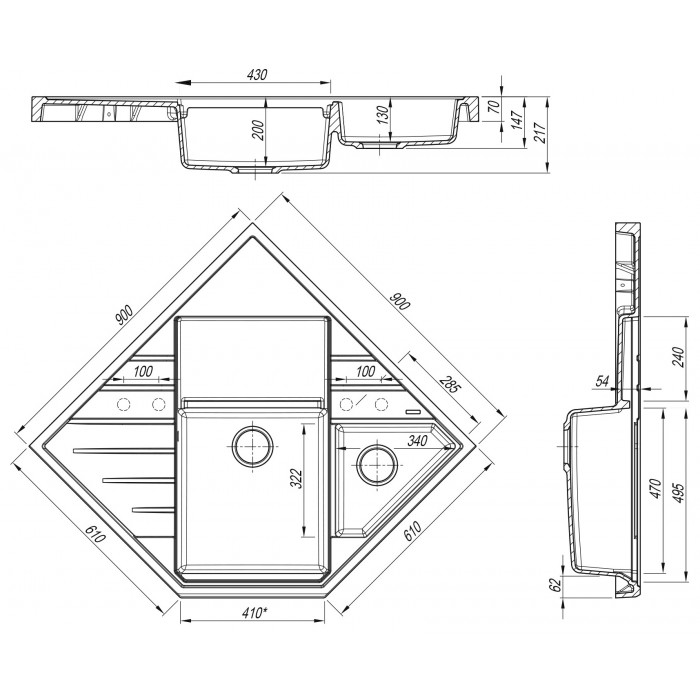 дополнительная чаша, угловая, отверстие под смеситель