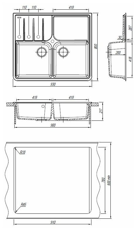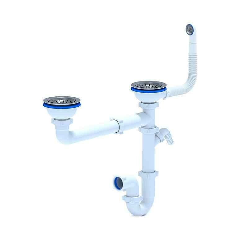 мойка, отводная арматура для двух разноуровневых чаш с выпусками 3 ½ ‘‘ (D=90мм) и двумя переливами