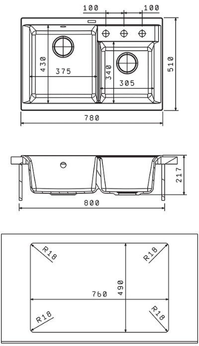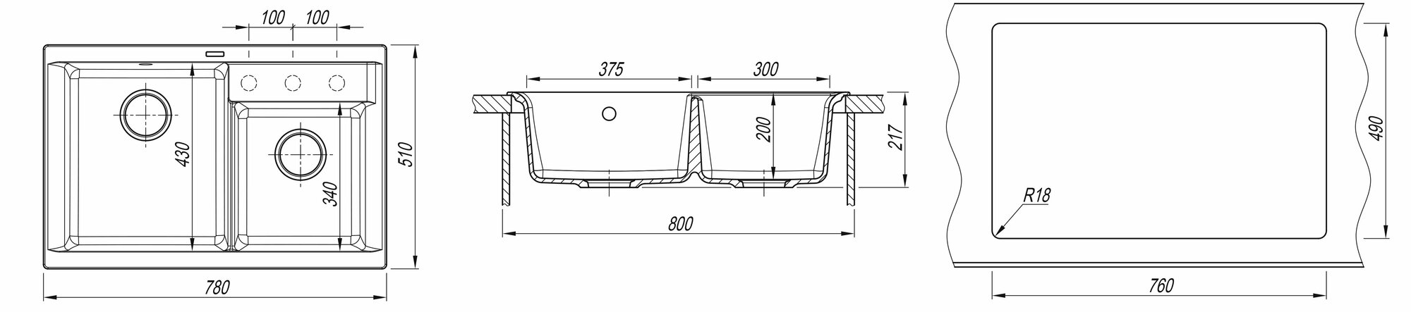 дополнительная чаша, ПереливС сифоном, дополнительная чаша,отверстие под смеситель, отверстие под смеситель