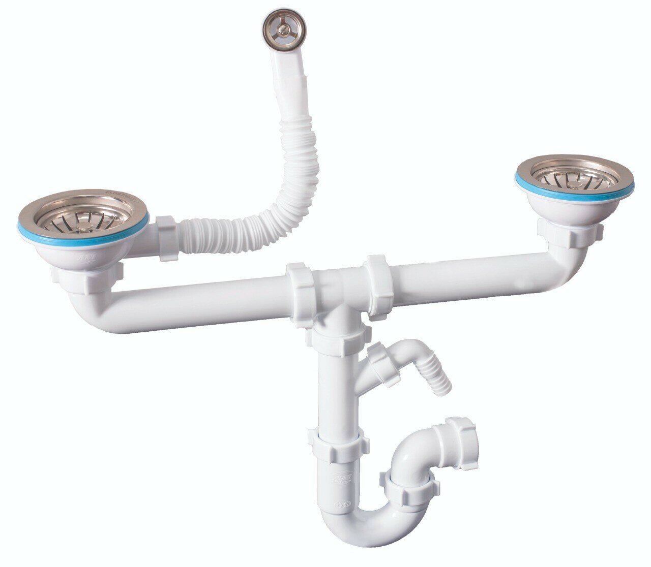 корзинчатый вентиль, отверстие под смеситель, сливная арматура, Отводная арматура с выпуском для двух одноуровневых чаш 3 ? ” (D=90 мм) с переливом