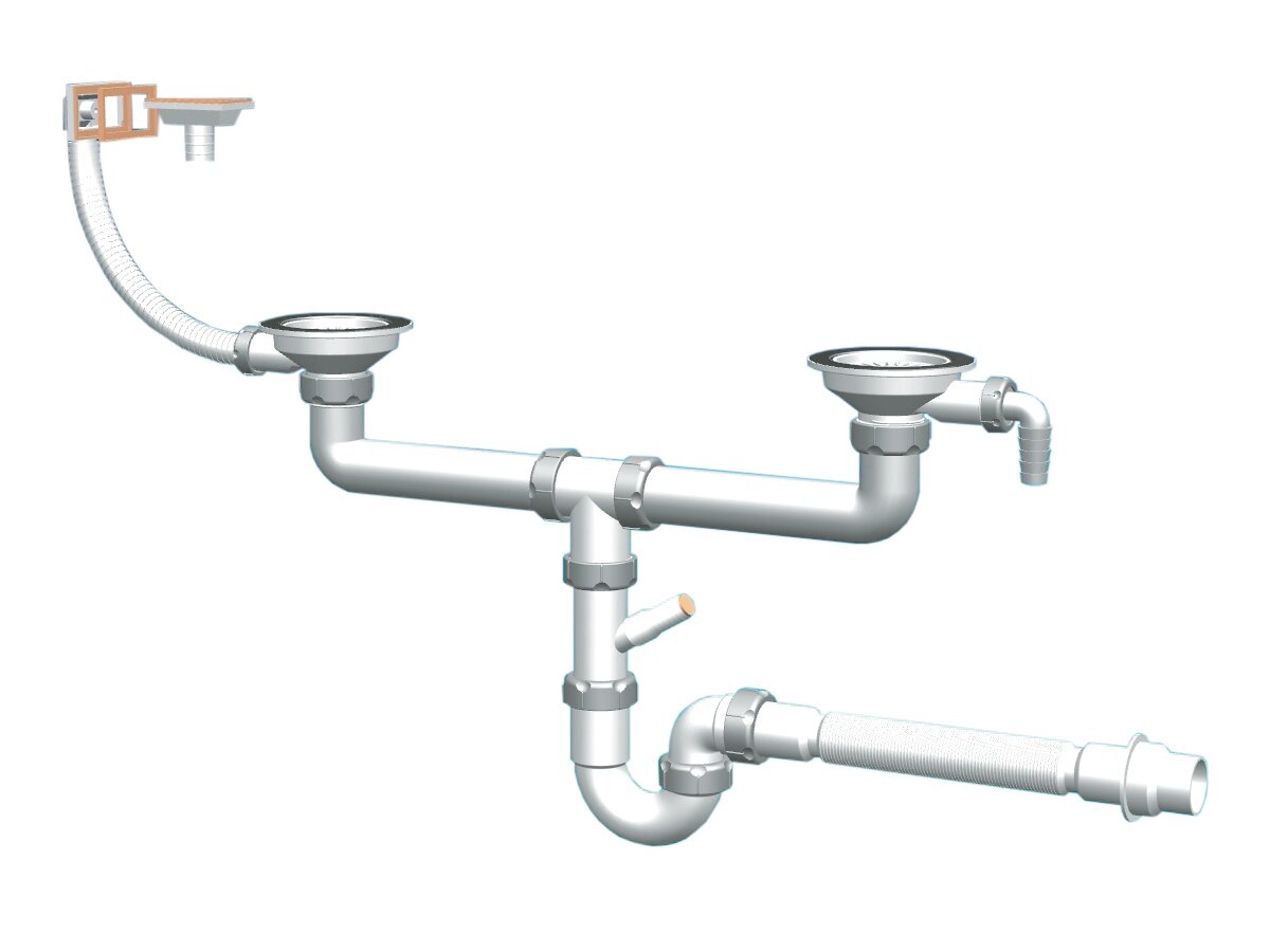 корзинчатый вентиль, сливная арматура, Отводная арматура с выпуском для двух одноуровневых чаш 3 ? ” (D=90 мм) с переливом (Комби), мойка
