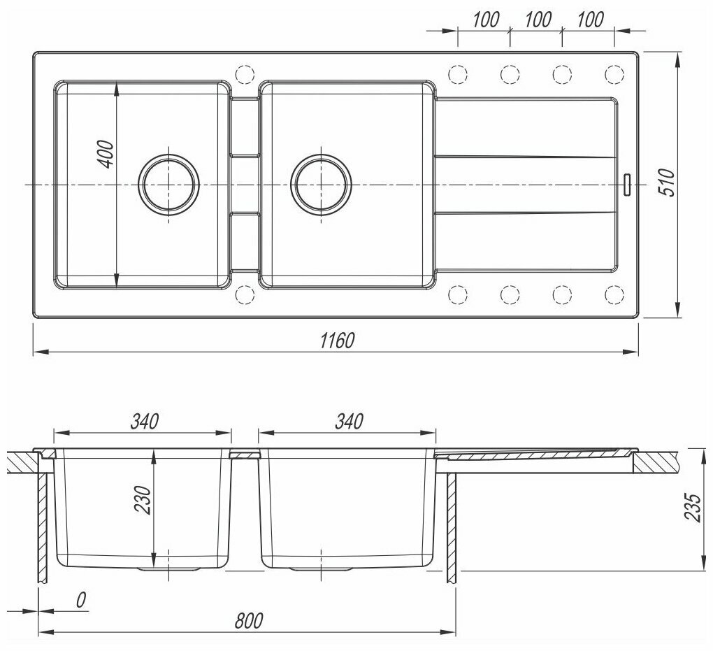 дополнительная чаша, С сифоном, дополнительная чаша,отверстие под смеситель, отверстие под смеситель