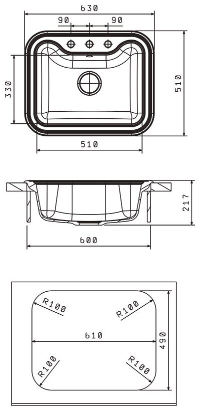 корзинчатый вентиль, отверстие под смеситель, сливная арматура, Мойка 1 шт, Отводная арматура с выпуском 3 ? ” (D=90 мм) и переливом
