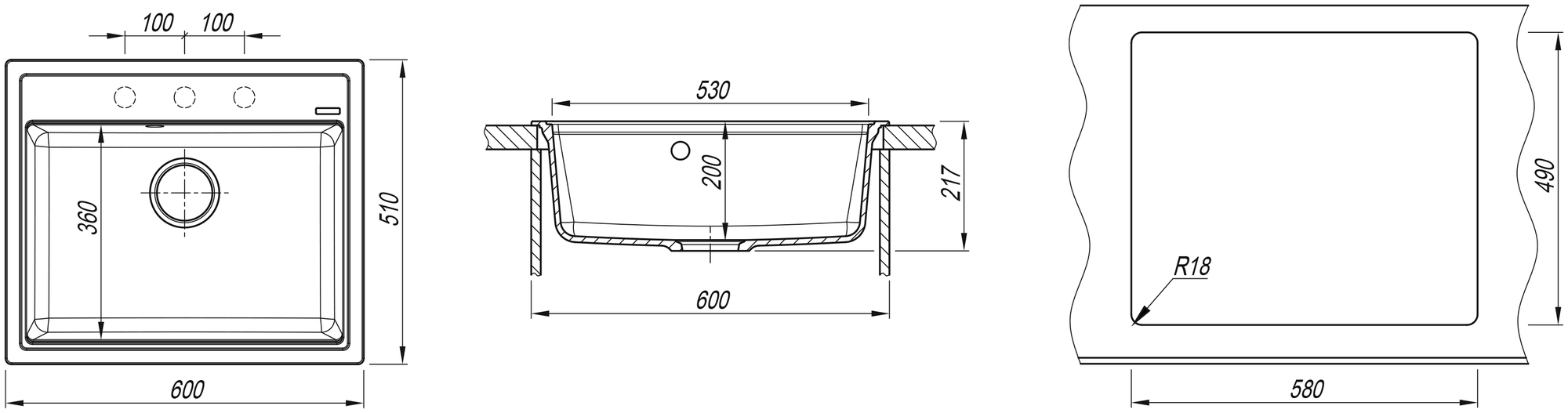 корзинчатый вентиль, отверстие под смеситель, сливная арматура, В комплект входит отводная арматура с выпуском 3 1/2" (D=90мм) и переливом, Отводная арматура с выпуском 3 ½ ” (D=90 мм) и переливом, мойка, набор крепежей и трафарет.