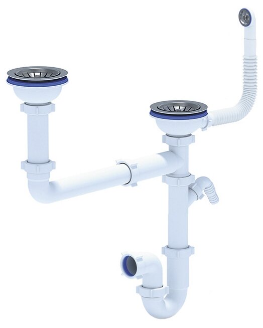 корзинчатый вентиль, отверстие под смеситель, сливная арматура, смеситель, Отводная арматура для двух разноуровневых чаш с выпусками 3 ? ” (D=90мм) и переливом, Отводная арматура с выпуском 3 ½ ” (D=90 мм) и переливом, мойка
