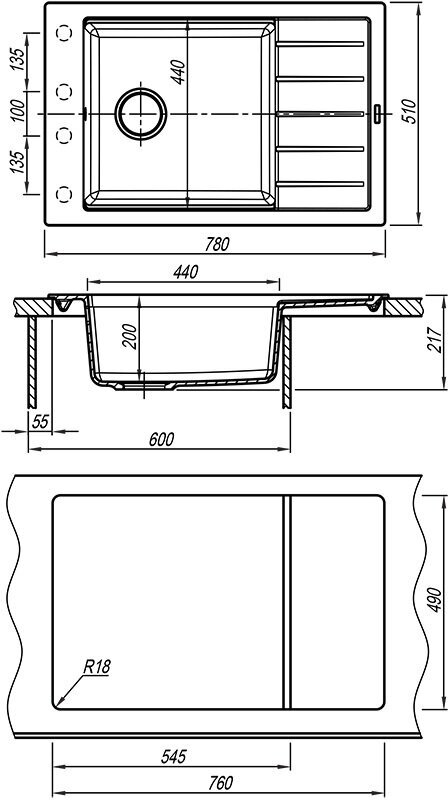 корзинчатый вентиль, крепеж, отверстие под смеситель, сливная арматура, смеситель, Отводная арматура с выпуском 3 ? ” (D=90 мм) и переливом, Отводная арматура с выпуском 3 ½ ” (D=90 мм) и переливом, мойка, решетка из нержавеющей стали