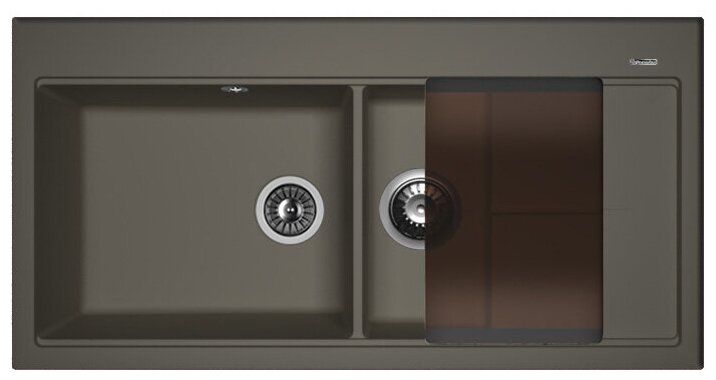 дополнительная чаша, Отводная арматура для двух разноуровневых чаш с выпусками 3 ½ ” (D=90мм) и переливом, отверстие под кран-фильтр, отверстие под смеситель, разделочная доска, сливная арматура