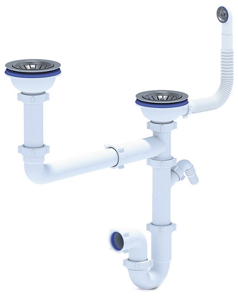 корзинчатый вентиль, отверстие под смеситель, сливная арматура, Отводная арматура для двух разноуровневых чаш с выпусками 3 ? ” (D=90мм) и переливом, документация, мойка