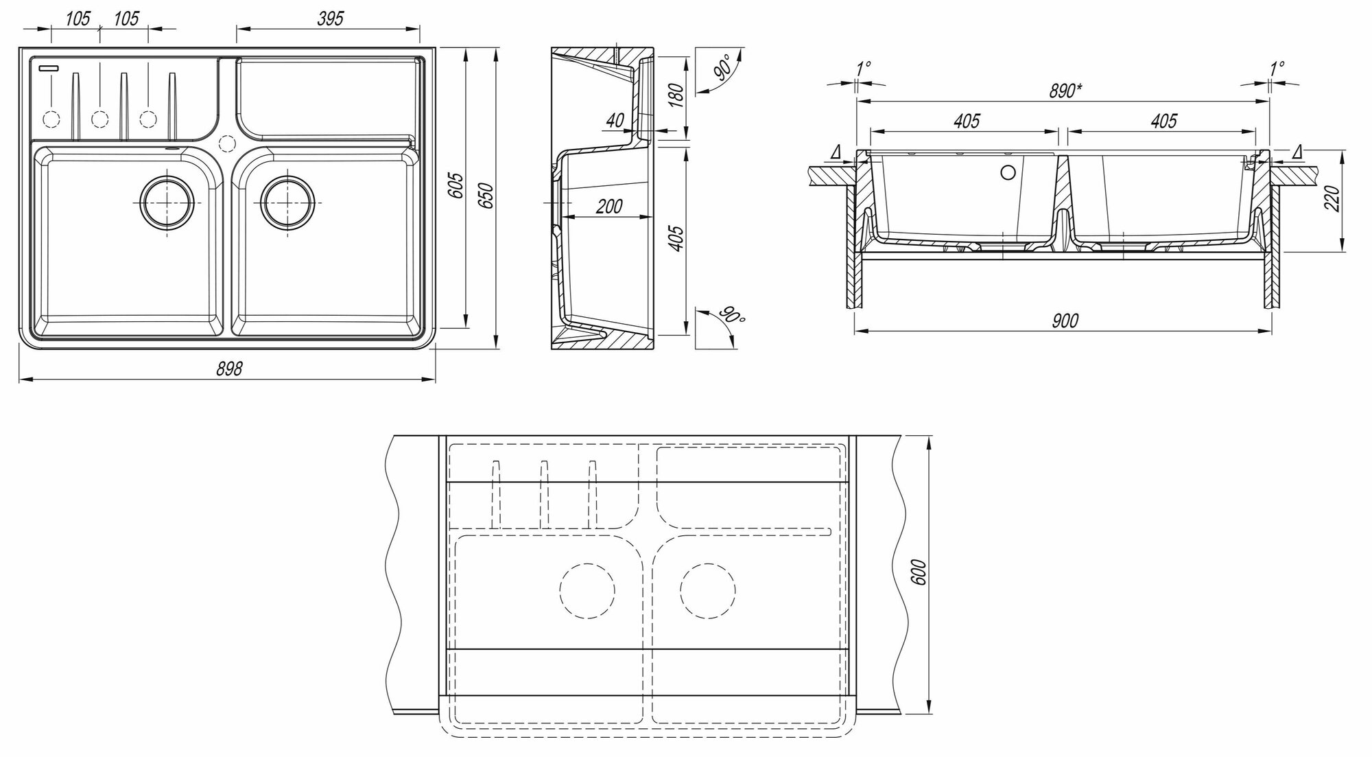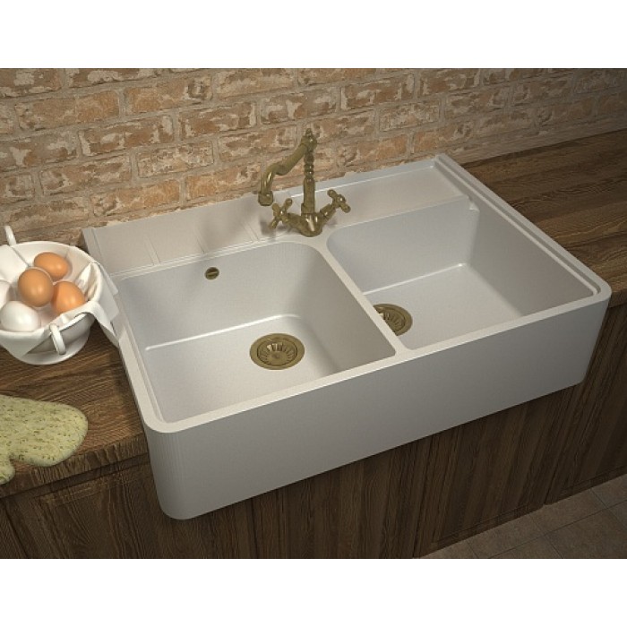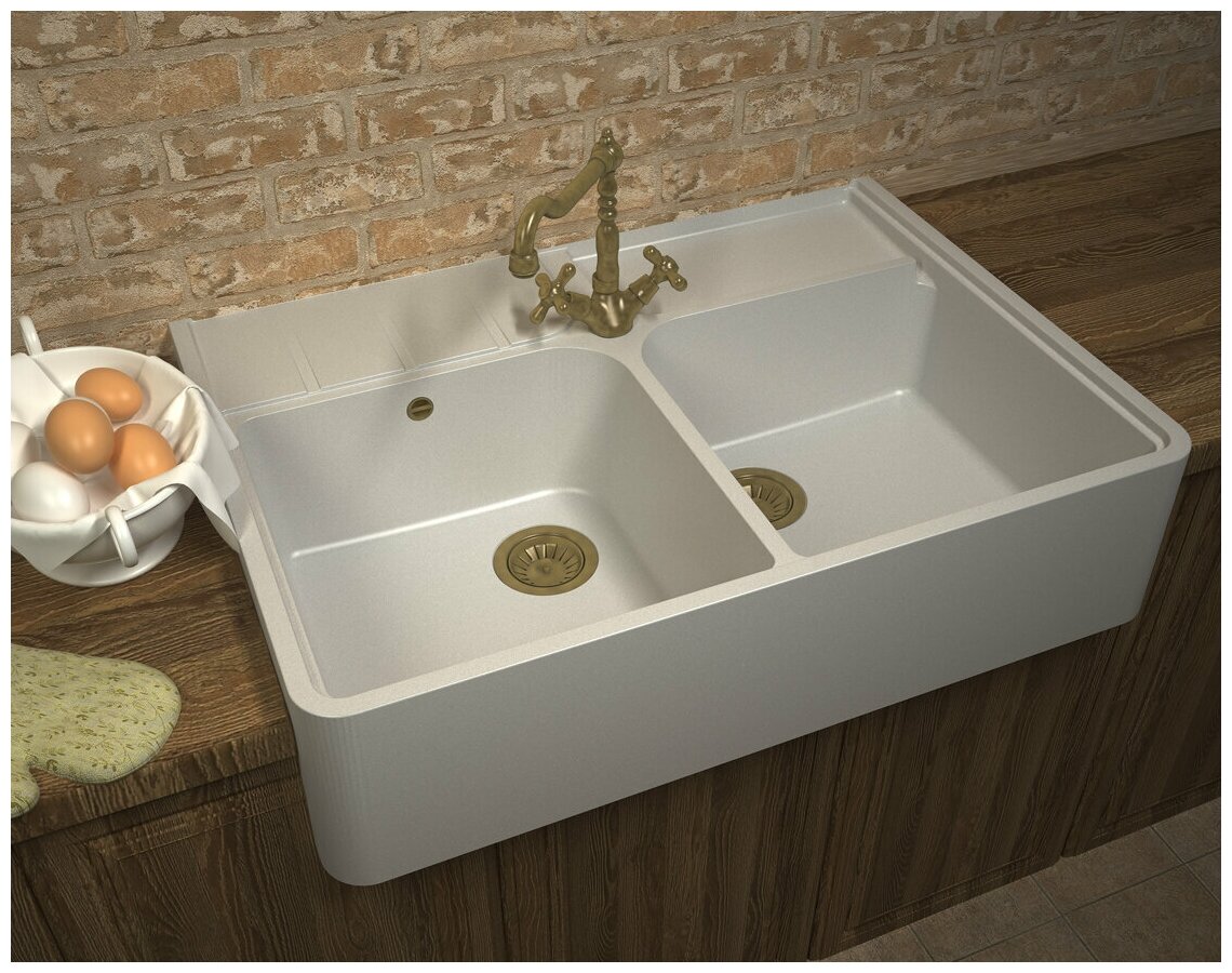 корзинчатый вентиль, отверстие под смеситель, разделочная доска, сливная арматура, Отводная арматура с выпуском для двух одноуровневых чаш 3 ? ” (D=90 мм) с переливом, мойка