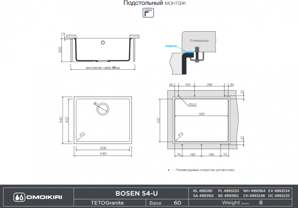 Скачать документы для Кухонная мойка Omoikiri Bosen 54-U-SA бежевый 4993163