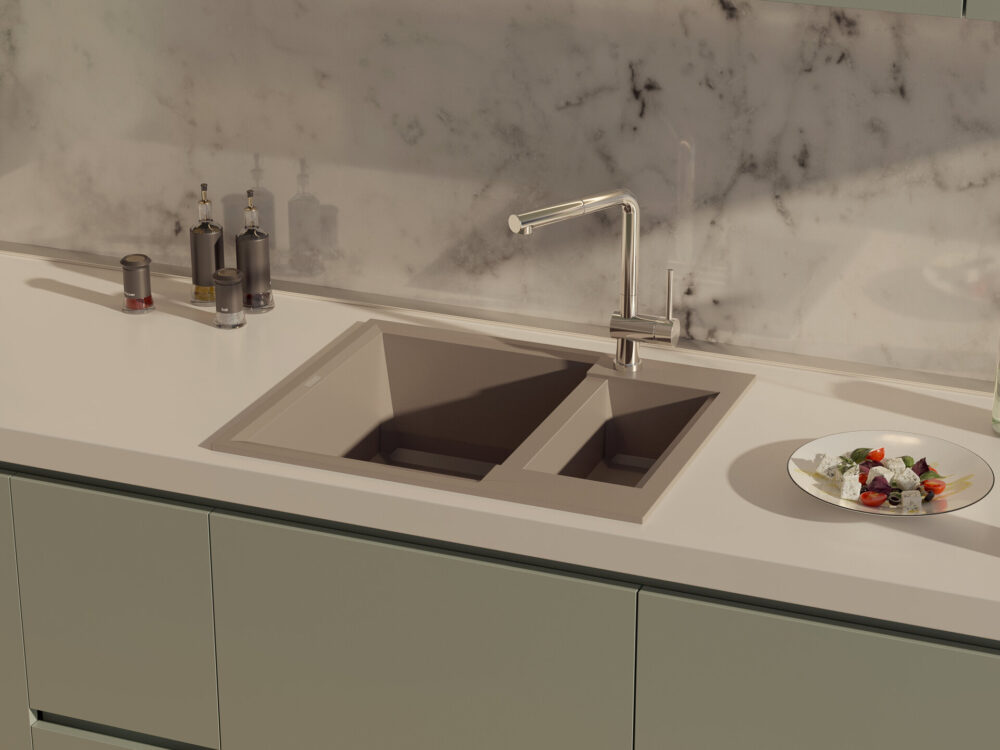 - Кухонная мойка изготовлена из матриала «Tetogranit», технология производства которого заключается в том, что частицы гранита, кварцевый песок и акриловую смолу объединяют в пресс-форме и обжигают при высокой температуре. Далее, для обеззараживания поверхности добавляют ионы серебра и волокна теторона (Tetoron), благодаря которым, на всём протяжении эксплуатации моек не происходит развитие бактерий, плесени и грибка. Также, при изготовлении моек из «Tetogranit» применяется специальный способ окрашивания частиц гранита: на их поверхность при температуре выше 700°С наносится пигмент, который за счет высокотемпературного нанесения проникает во внутренние структуры камня;