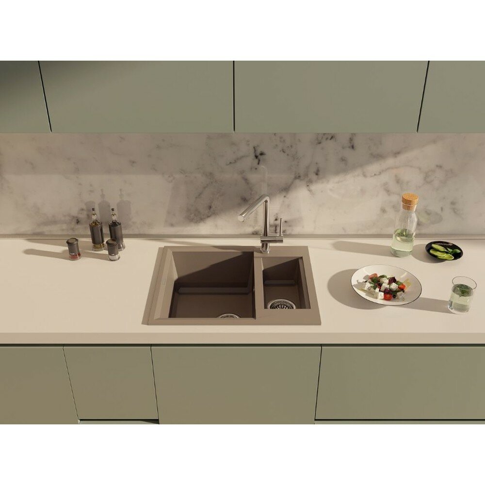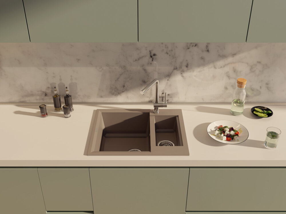 - Кухонная мойка изготовлена из матриала «Tetogranit», технология производства которого заключается в том, что частицы гранита, кварцевый песок и акриловую смолу объединяют в пресс-форме и обжигают при высокой температуре. Далее, для обеззараживания поверхности добавляют ионы серебра и волокна теторона (Tetoron), благодаря которым, на всём протяжении эксплуатации моек не происходит развитие бактерий, плесени и грибка. Также, при изготовлении моек из «Tetogranit» применяется специальный способ окрашивания частиц гранита: на их поверхность при температуре выше 700°С наносится пигмент, который за счет высокотемпературного нанесения проникает во внутренние структуры камня;