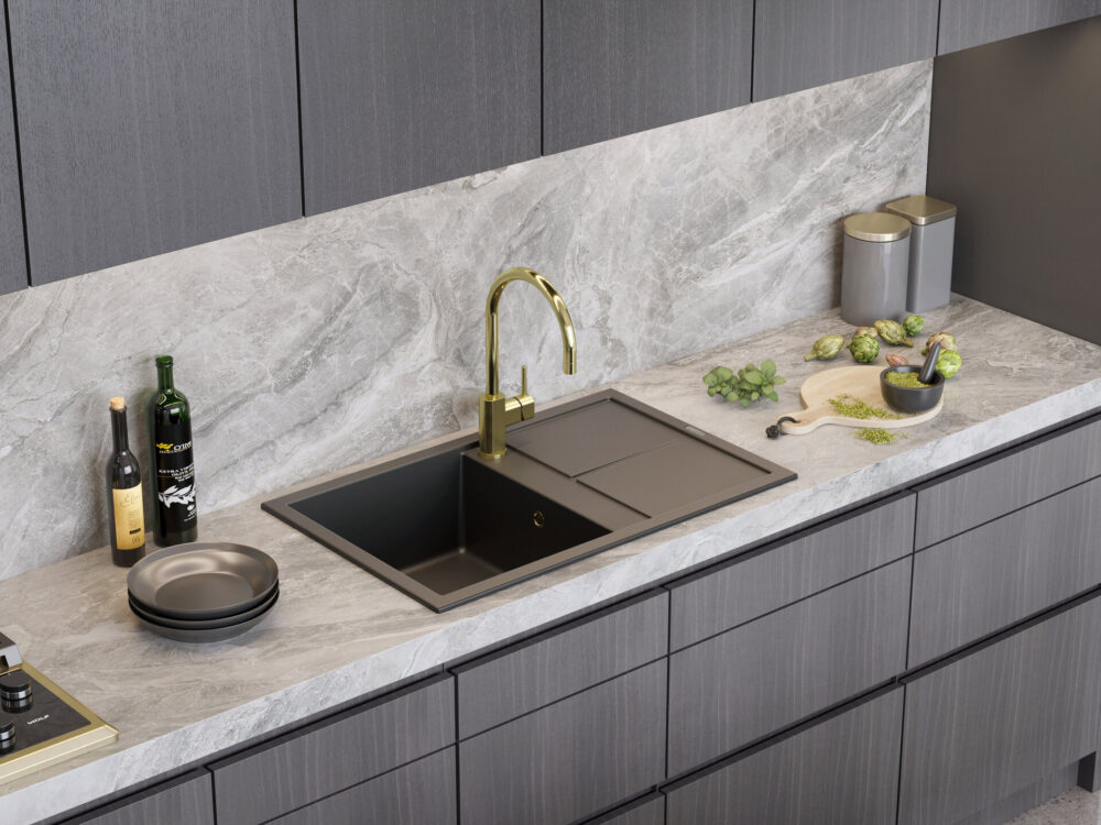 - Кухонная мойка изготовлена из матриала «Tetogranit», технология производства которого заключается в том, что частицы гранита, кварцевый песок и акриловую смолу объединяют в пресс-форме и обжигают при высокой температуре. Далее, для обеззараживания поверхности добавляют ионы серебра и волокна теторона (Tetoron), благодаря которым, на всём протяжении эксплуатации моек не происходит развитие бактерий, плесени и грибка. Также, при изготовлении моек из «Tetogranit» применяется специальный способ окрашивания частиц гранита: на их поверхность при температуре выше 700°С наносится пигмент, который за счет высокотемпературного нанесения проникает во внутренние структуры камня;