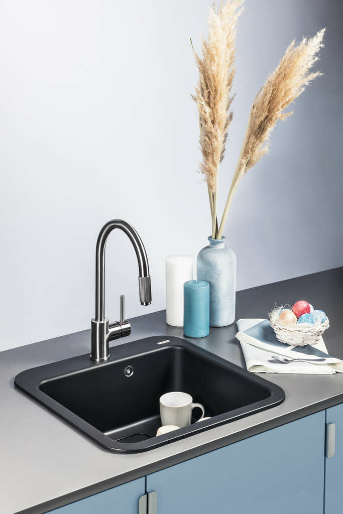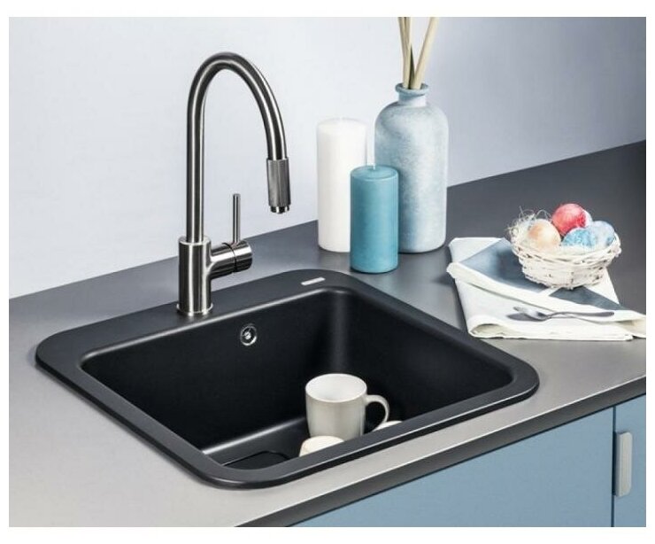- Кухонная мойка изготовлена из матриала «Artgranit», технология производства которого заключается в том, что частицы кварца, гранита и прочного связующего полимера нового поколения, свойства которого похожи на акриловую смолу, соединяют вместе и помещают в форму. После застывания получается готовая мойка;