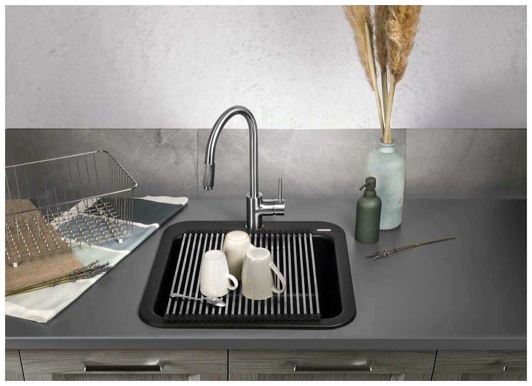 - Помимо гранита, в состав материала входит молотый кварц мельчайших размеров, которому характерны непревзойденная прочность и устойчивость к природным и химическим воздействиям. Свойства данного компонента вместе с долговечностью гранита обеспечивают мойке прочность и делают её устойчивой к любым механическим повреждениям: деформациям, сколам;