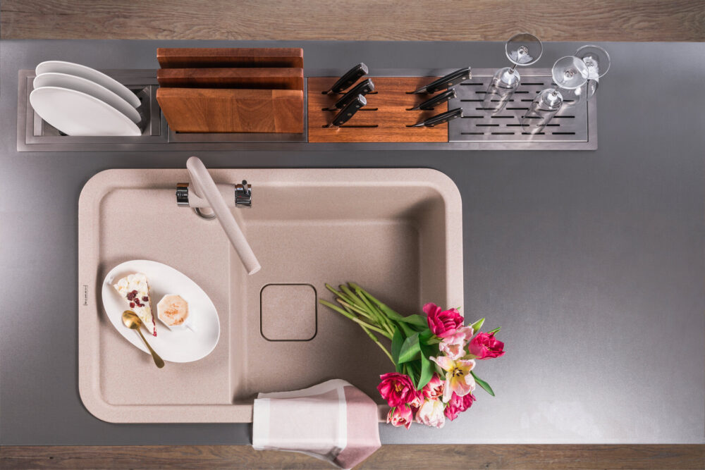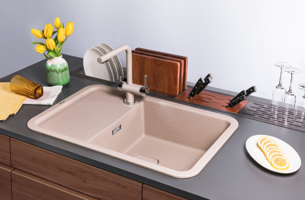 - Помимо гранита, в состав материала входит молотый кварц мельчайших размеров, которому характерны непревзойденная прочность и устойчивость к природным и химическим воздействиям. Свойства данного компонента вместе с долговечностью гранита обеспечивают мойке прочность и делают её устойчивой к любым механическим повреждениям: деформациям, сколам;