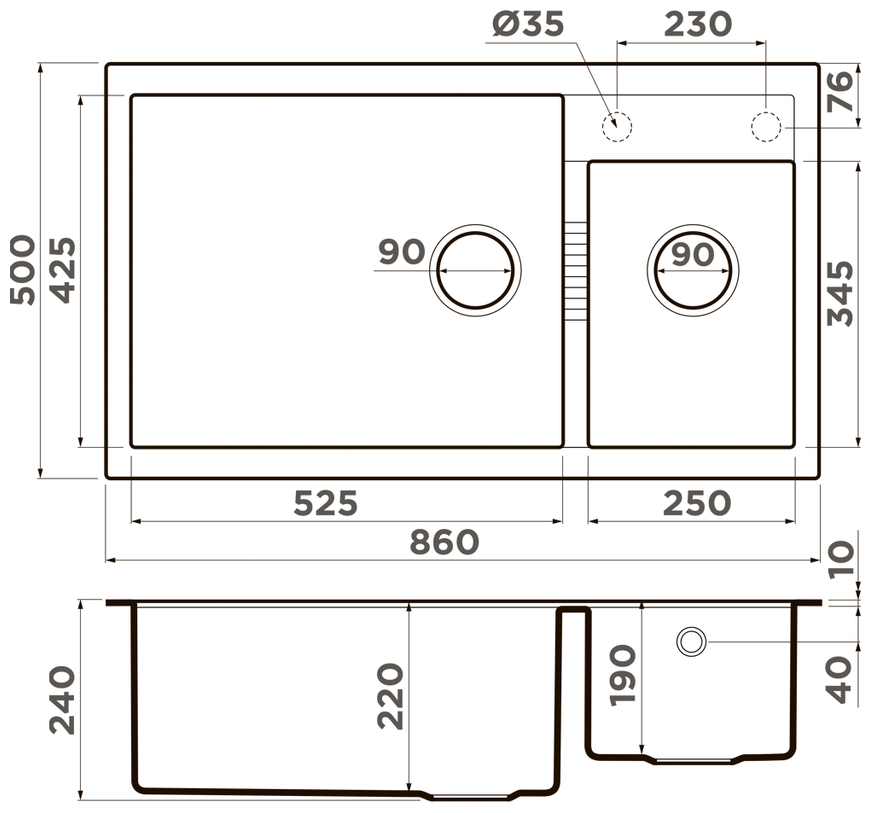 - Мойка черного цвета создана из материала «Tetogranit Metal». В его составе: акриловая смола и натуральный гранит с добавлением металлических частиц, которые придают блеск и мерцание поверхности мойки. «Tetogranit Metal» отличается максимальной устойчивостью к температурным перепадам и ударам;
