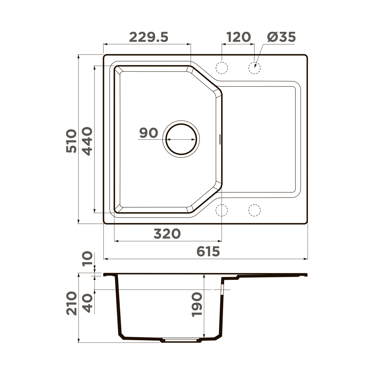 - Кухонная мойка изготовлена из матриала «Artgranit», технология производства которого заключается в том, что частицы кварца, гранита и прочного связующего полимера нового поколения, свойства которого похожи на акриловую смолу, соединяют вместе и помещают в форму. После застывания получается готовая мойка;