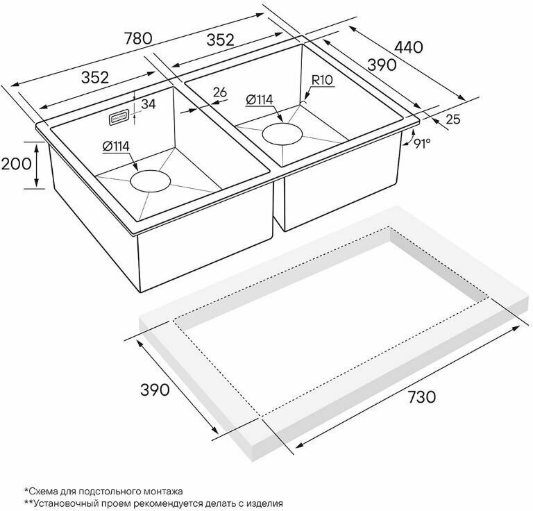 Комплект для подстольного монтажа, Комплект крепежей для врезного монтажа, Отводная арматура (слив-перелив), Сифон бутылочного типа с подключением посудомоечной машины (ПММ).