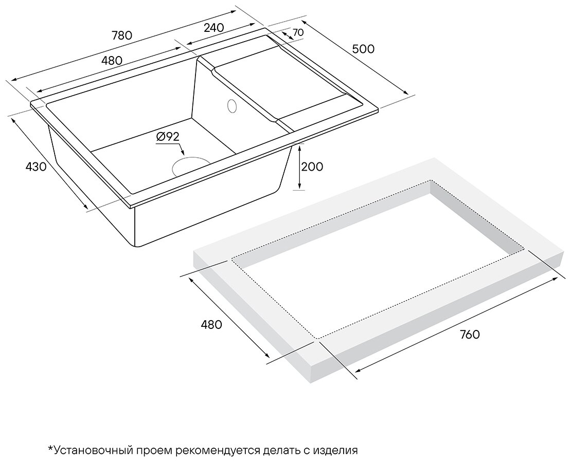 комплектация: мойка, сифон, гарантийный талон, инструкция; диаметр слива 92 мм