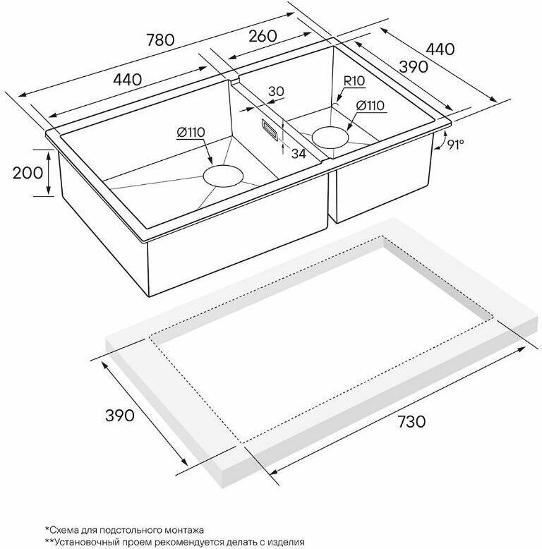 диаметр слива: 9.2 см; без готовых отверстий под смеситель; оснащение: сифон; комплектация: мойка, сифон, гарантийный талон, инструкция