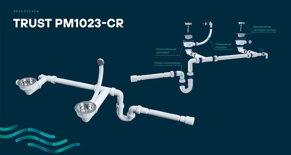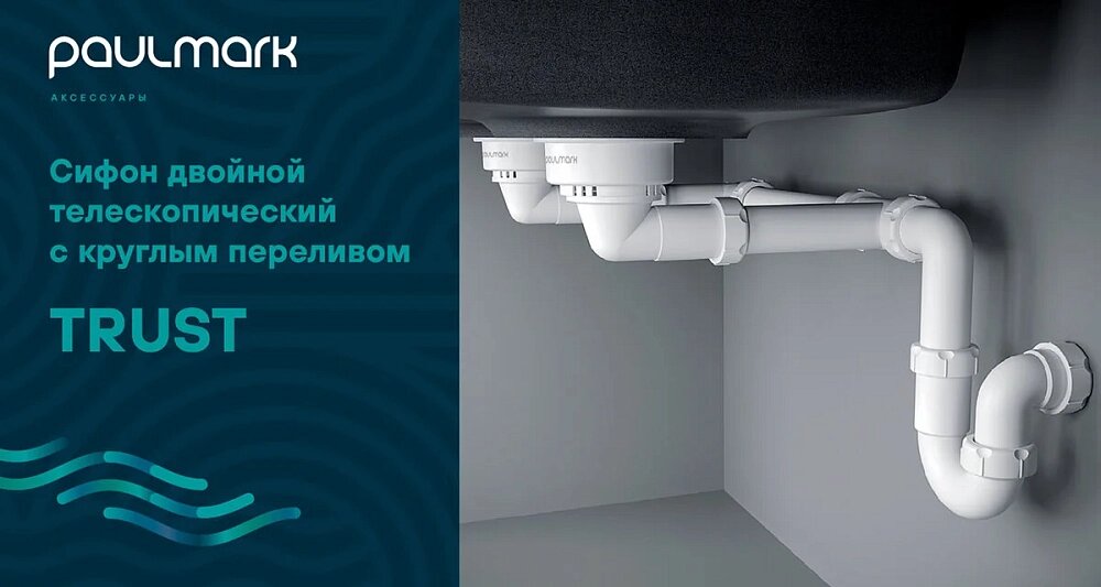 сливная арматура, S-образный телескопический сифон с подключением посудомоечной машины (ПММ), Декоративная накладка на перелив., Отводная арматура (слив-перелив)