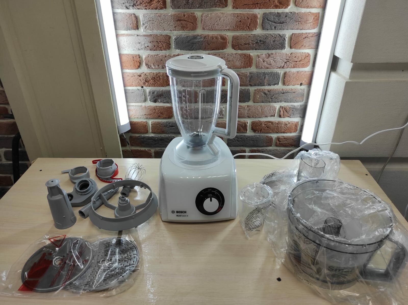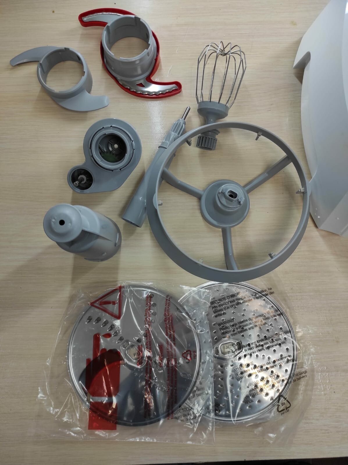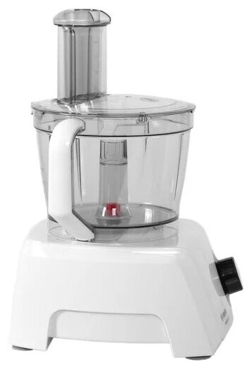 Большая пластиковая чаша с крышкой и толкателем (объем 3,9 л), блендер (объем 1,5 л), насадка для замеса теста, венчик из нержавеющей стали, диски из нержавеющей стали, держатель дисков, терка мелкая, двухсторонний диск терка/шинковка из нержавеющей стали