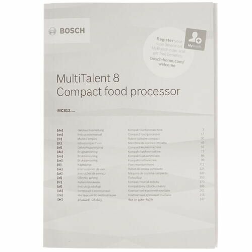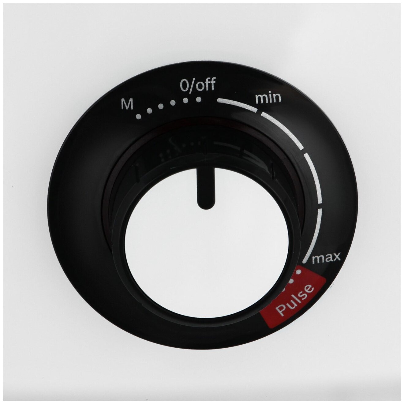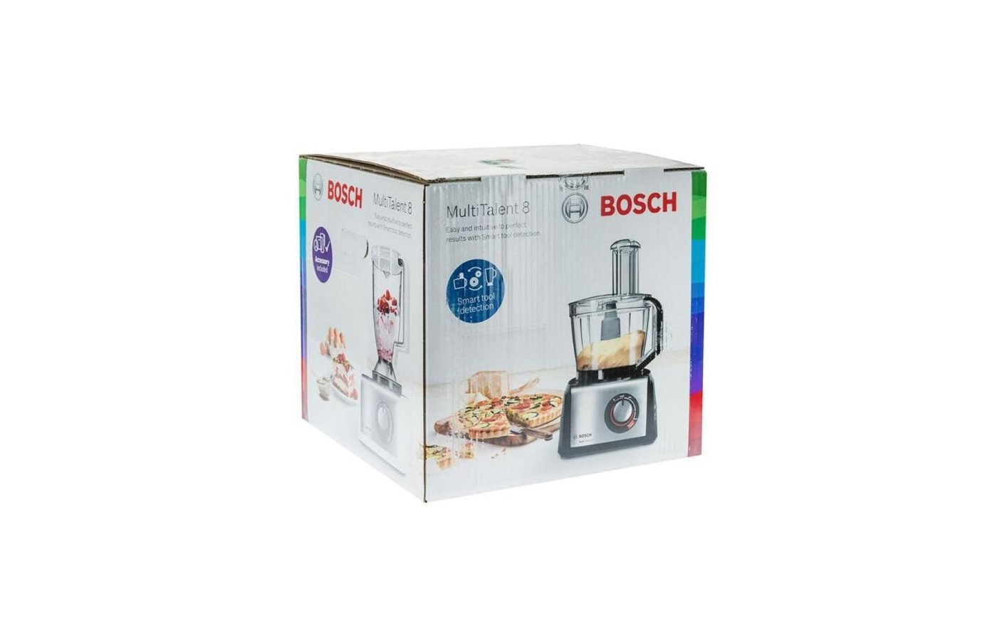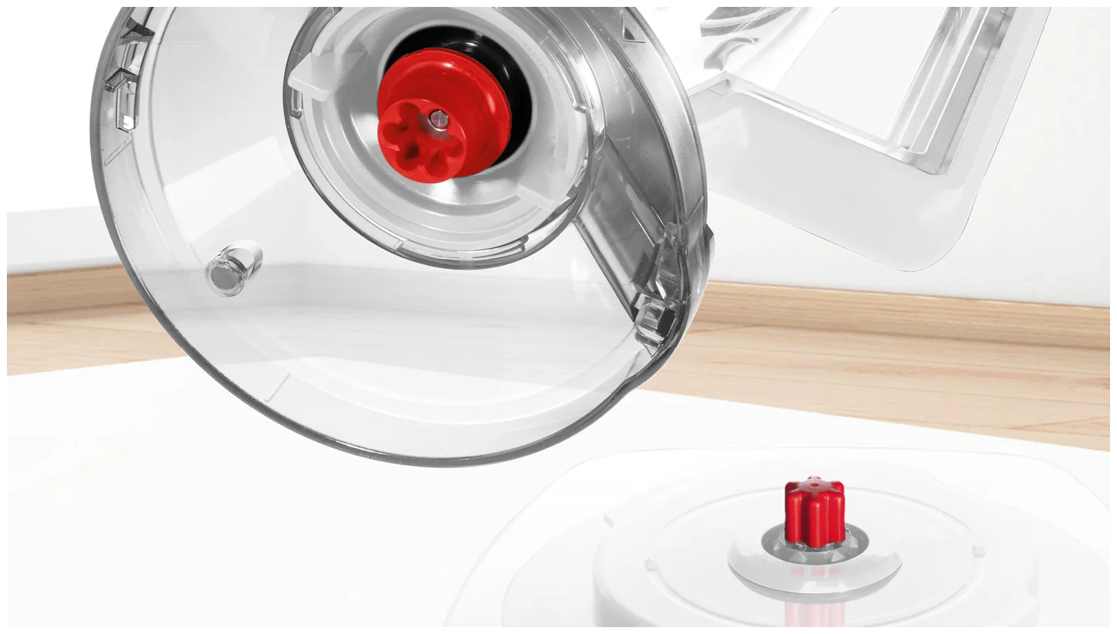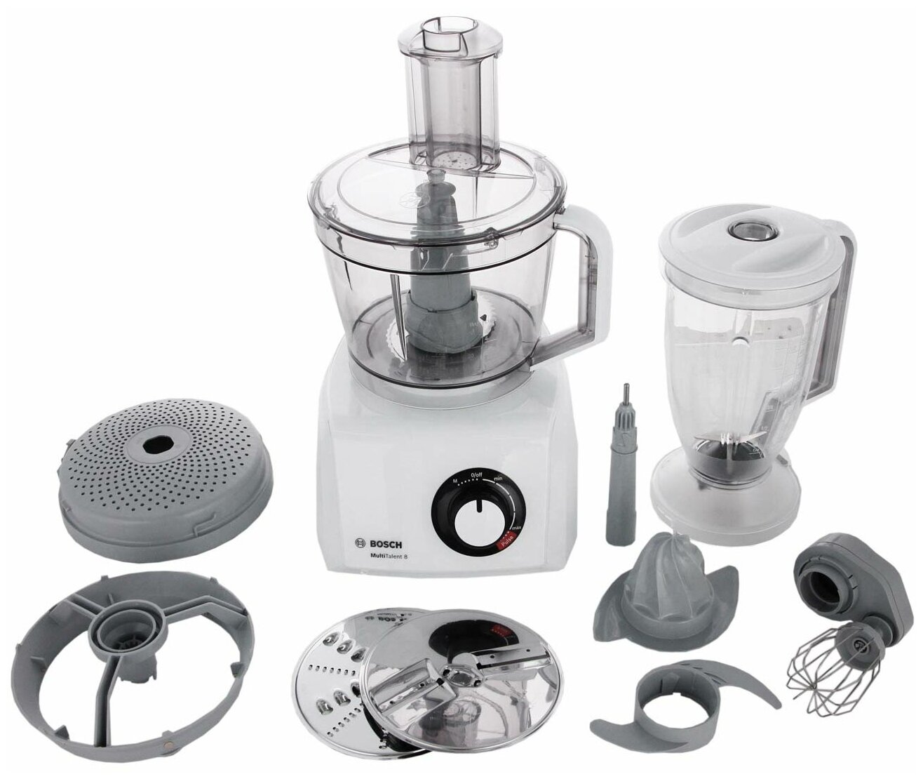 Большая пластиковая чаша с крышкой и толкателем, объем 3,9л для 750гр муки + ингредиенты (макс. 1.5 кг) Блендер (пластик), объем 1,5 л Двухсторонний диск - шинковка (крупная/мелкая), двухсторонний диск - терка (крупная/мелкая) Диски из нержавеющей стали Держатель дисков Насадка для замеса теста (пластик) Венчик из нерж. стали для взбивания крема, яичных белков и легкого теста Пресс для приготовления сока из цитрусовых
