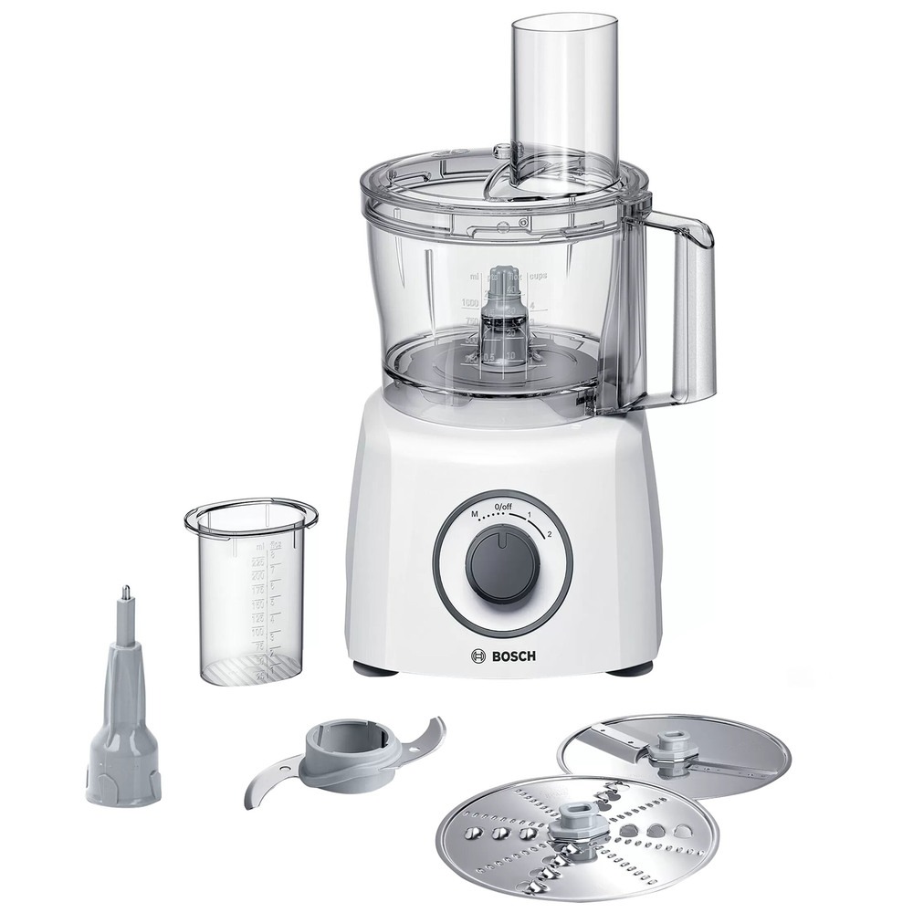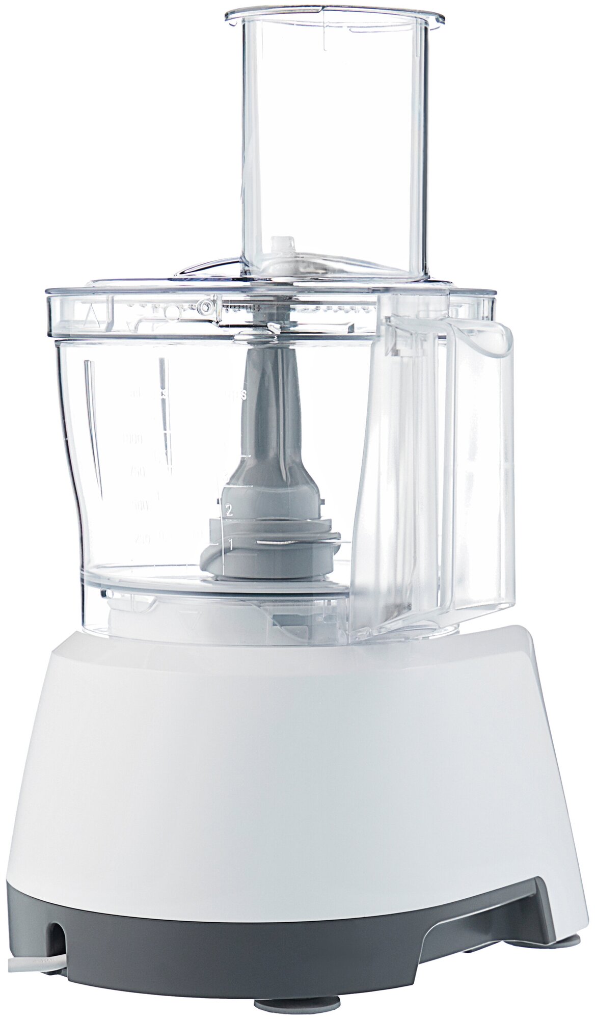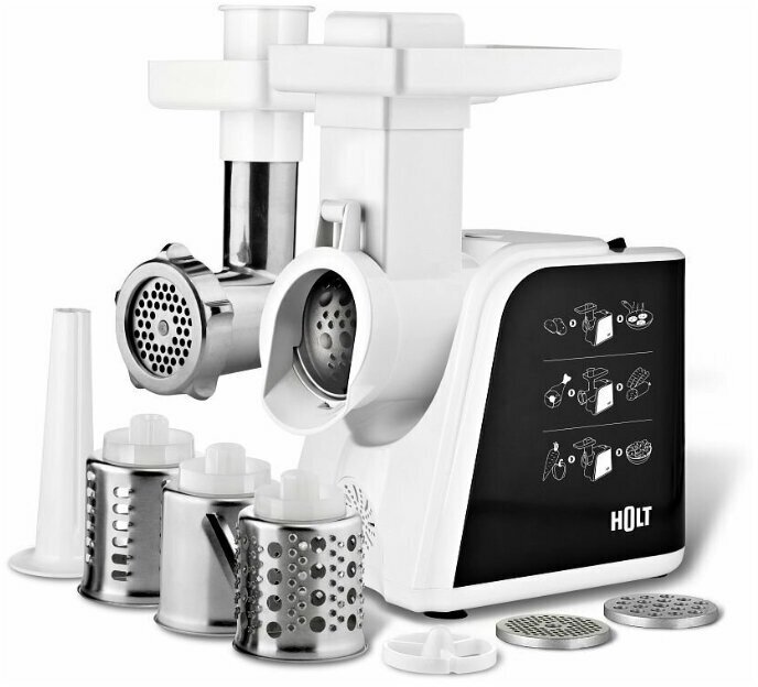 Кухонный комбайн, двухсторонний диск-шинковка (крупная/мелкая), двухсторонний диск-терка (крупная/мелкая), пластиковая чаша с крышкой, толкатель, инструкция