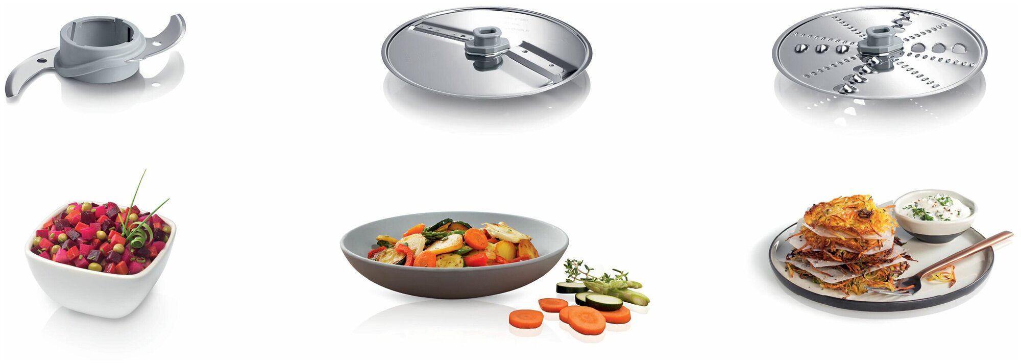 венчик для взбивания, для замешивания теста, для нарезки ломтиками, насадка-терка, универсальный нож, Нож-измельчитель, Шинковка, двухсторонний диск - терка (крупная/мелкая), двухсторонний диск - шинковка (крупная/мелкая), диск для шинковки, насадка для взбивания, насадка для нарезки ломтиками общее число насадок: 3, насадка для нарезки ломтиками: 1 в комплекте, насадка для нарезки ломтиками: 1 в комплекте общее число насадок: 3, насадка для теста, терка: 1 в комплекте