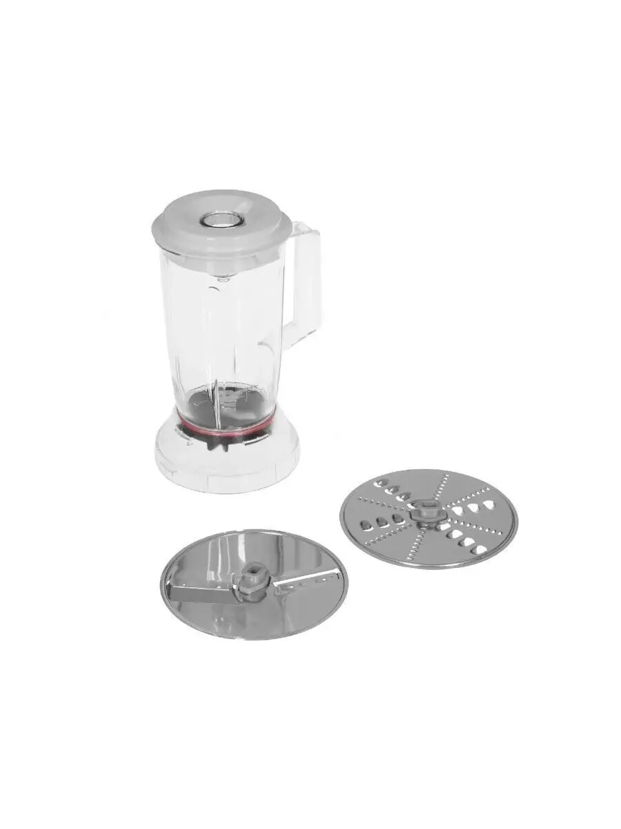 Комбайн, крышка, толкатель, двусторонний диск-резка, двусторонний диск-шинковка, универсальный нож с защитным чехлом, держатель насадок, смесительная чаша, стакан для блендера, инструкция
