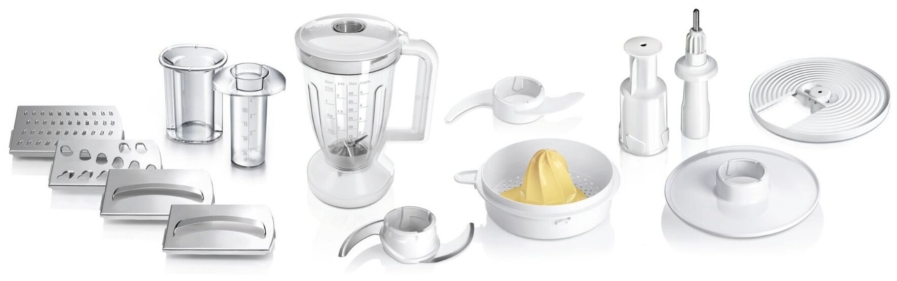 венчик для взбивания, для замешивания теста, насадка-терка, Ломтерезка, Насадка-блендер, Нож-измельчитель, Соковыжималка, Чаша-измельчитель, Шинковка, для взбивания