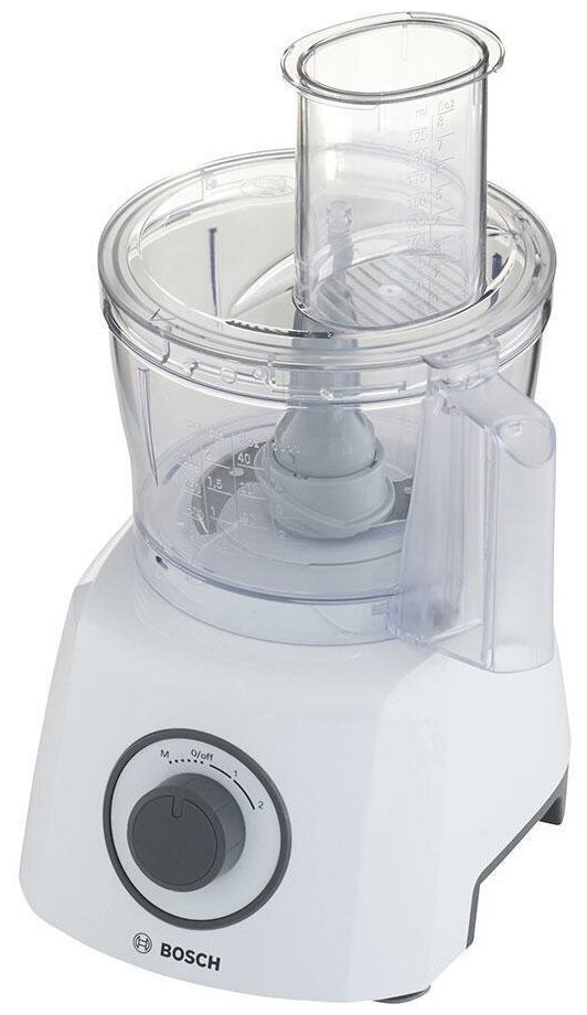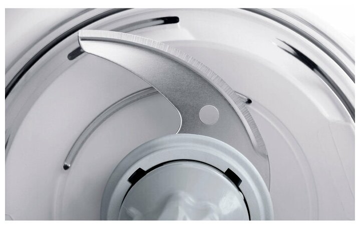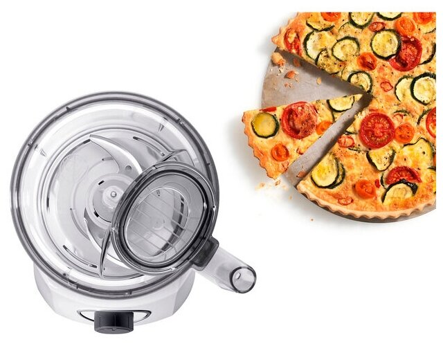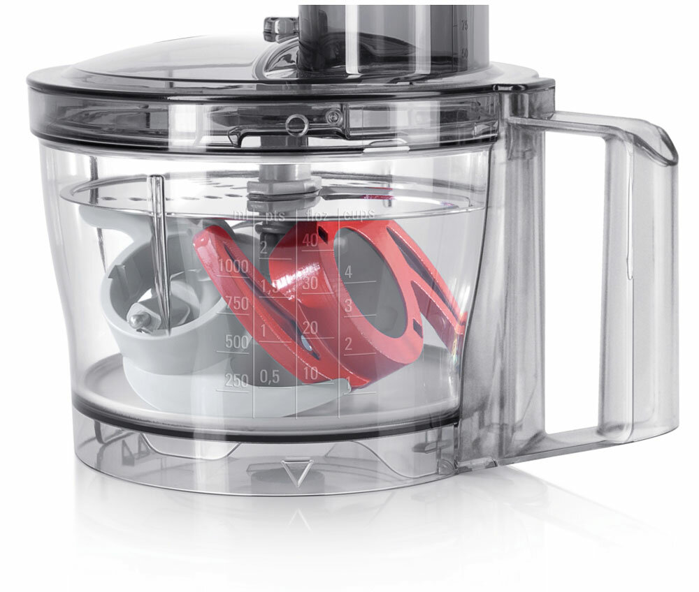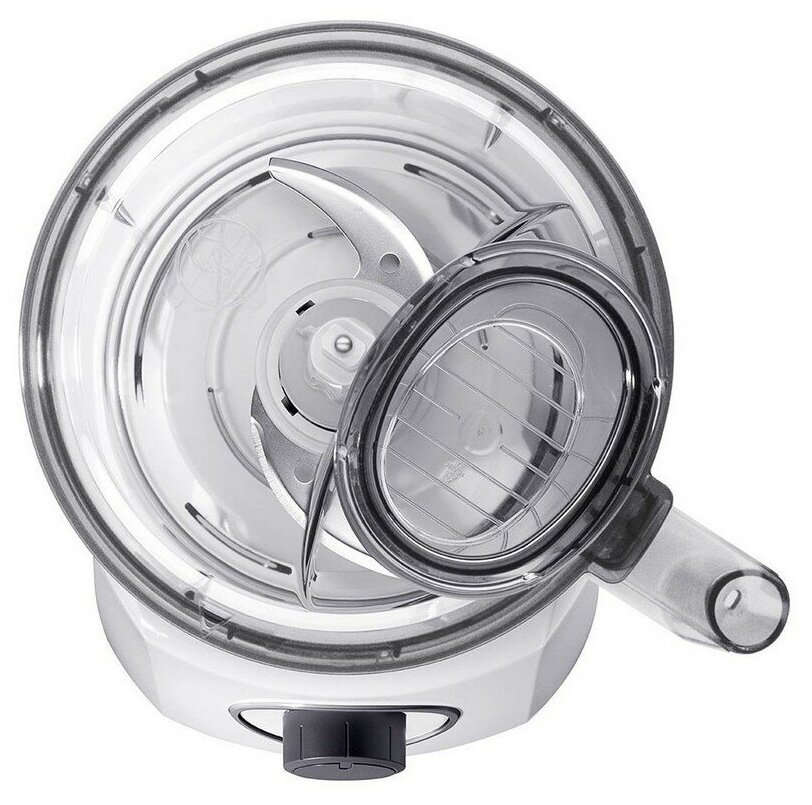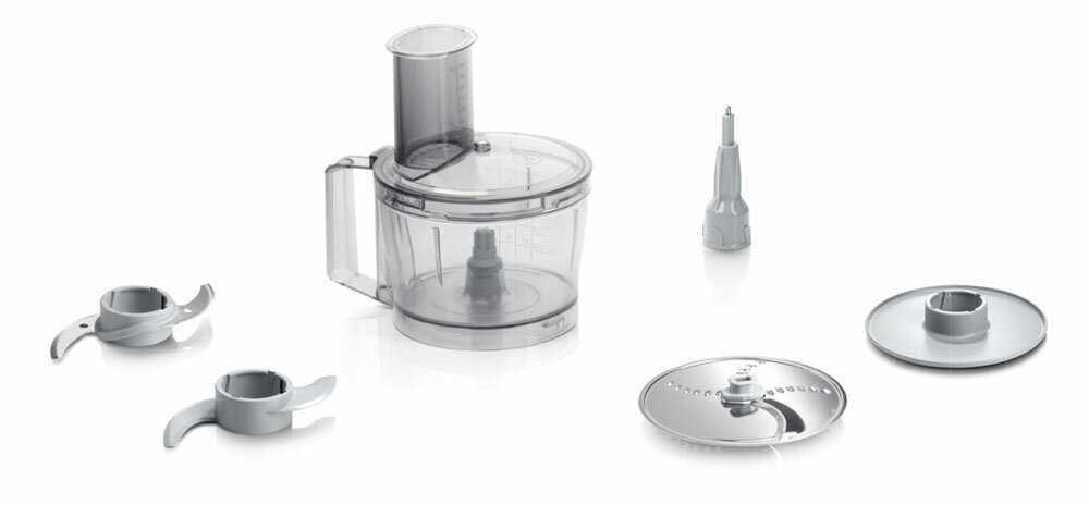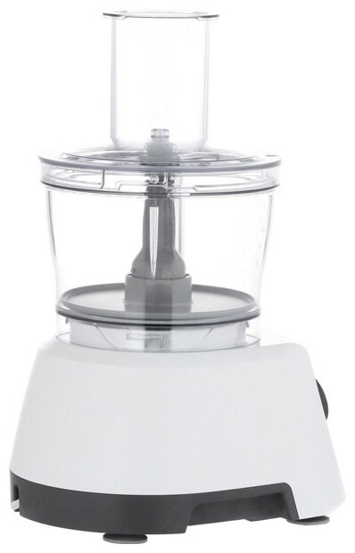 Основной блок, прозрачная пластиковая чаша, толкатель, крышка, двухсторонний диск терка/шинковка из нержавеющей стали, насадка для замеса теста, диск для взбивания, инструкция