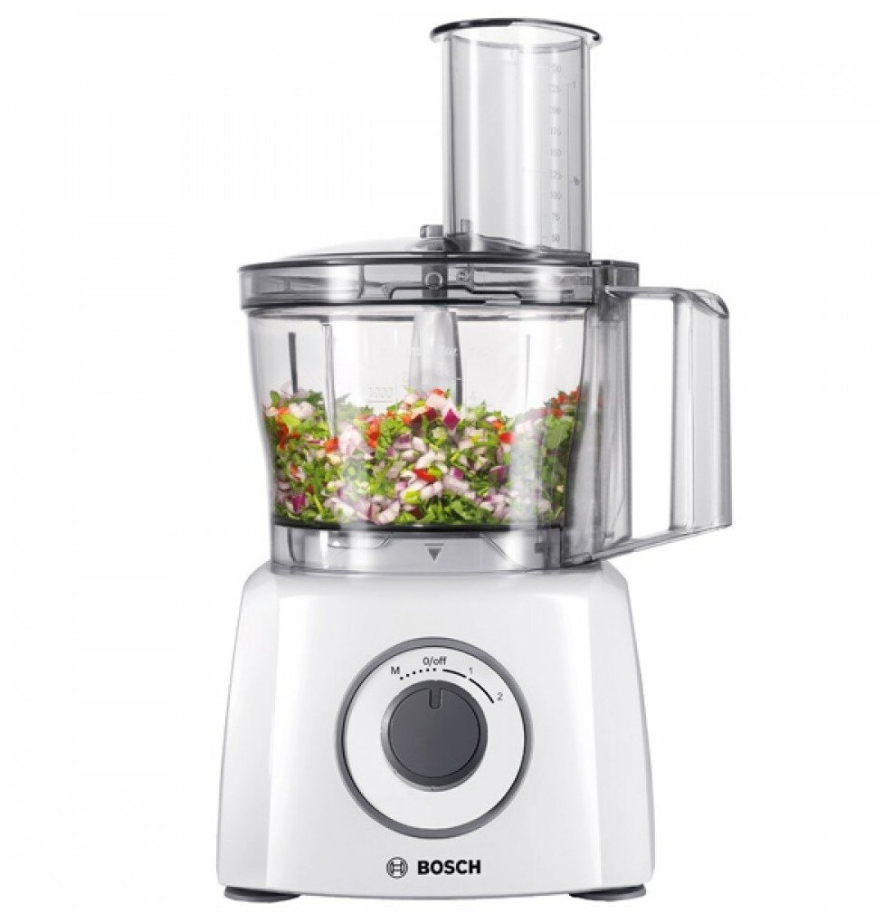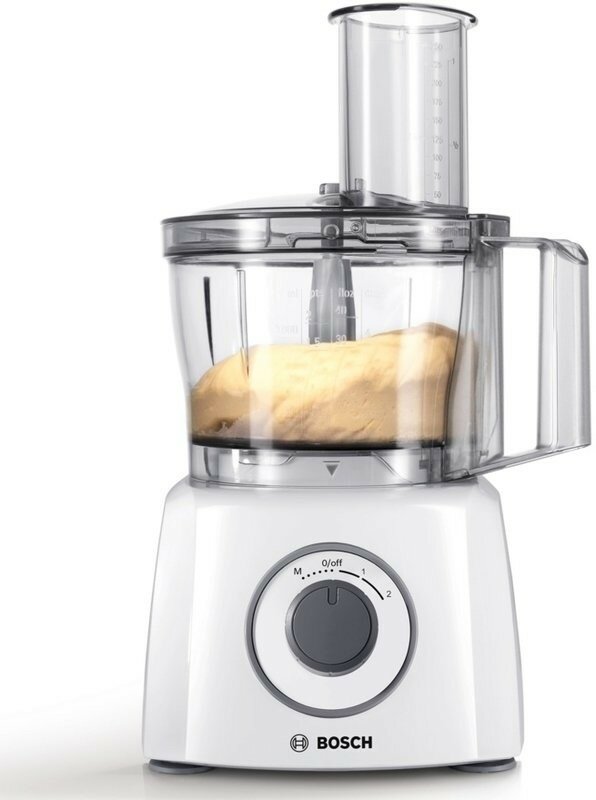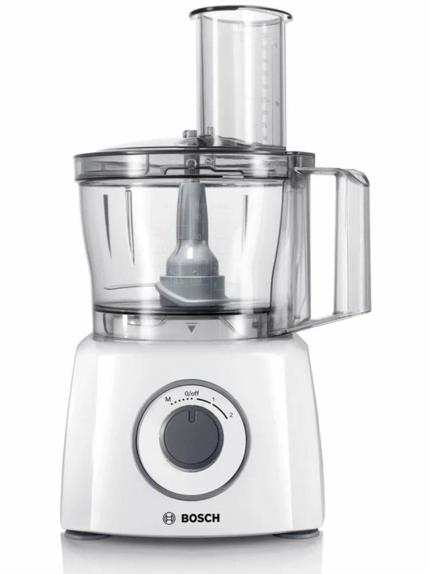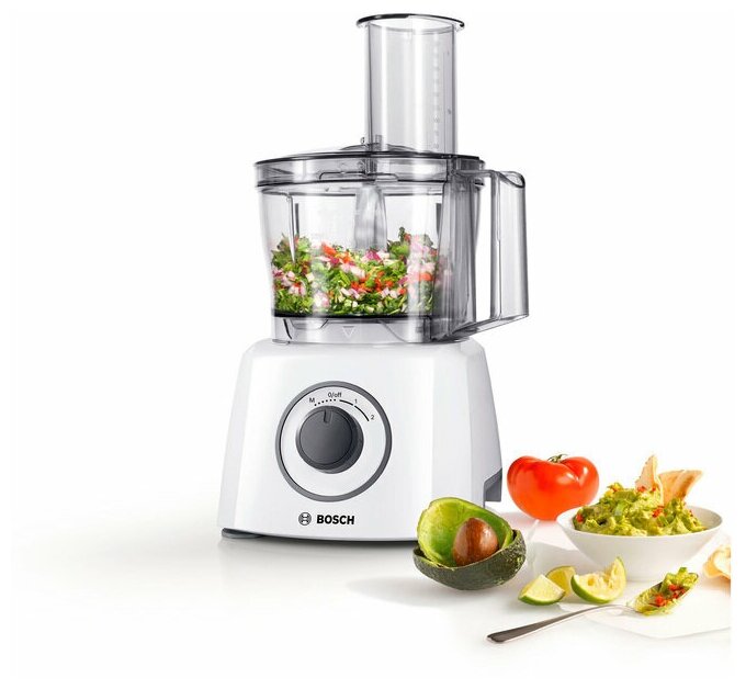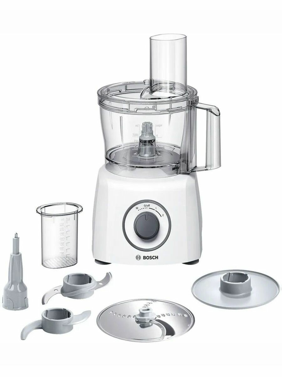 Основной блок, прозрачная пластиковая чаша, толкатель, крышка, двухсторонний диск терка/шинковка из нержавеющей стали, насадка для замеса теста, диск для взбивания, инструкция